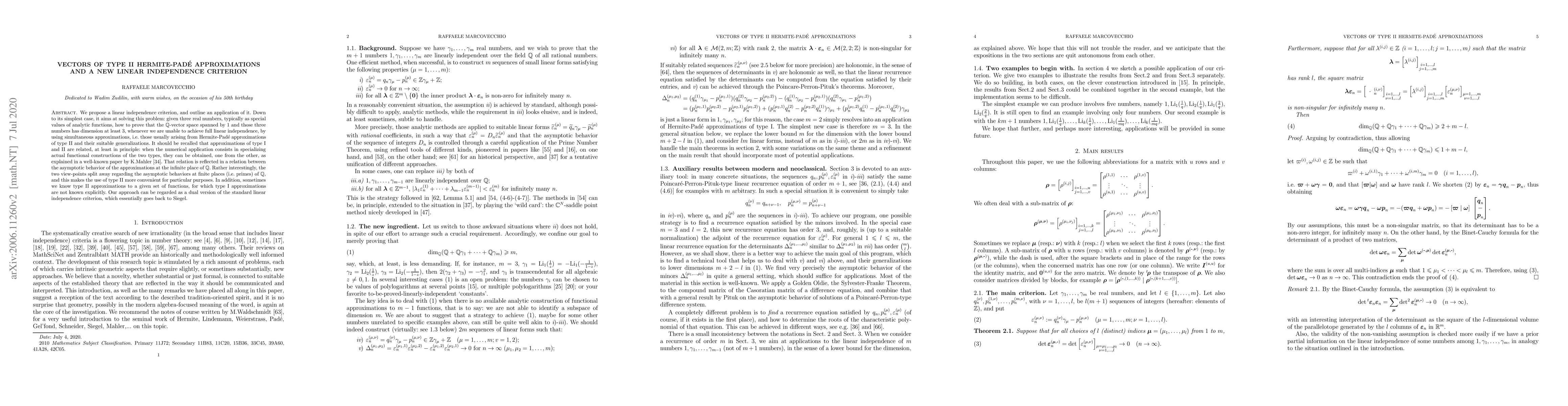 We propose a linear independence criterion, and outline an application of it. Down to its simplest case, it aims at solving this problem: given three real numbers, typically as special values of analytic functions, how to prove that the $\mathbb{Q}$-vector space spanned by $1$ and those three numbers has dimension at least 3, whenever we are unable to achieve full linear independence, by using simultaneous approximations, i.e. those usually arising from Hermite-Pad\'e approximations of type II and their suitable generalizations. It should be recalled that approximations of type I and II are related, at least in principle: when the numerical application consists in specializing actual functional constructions of the two types, they can be obtained, one from the other, as explained in a well-known paper by K.Mahler [34]. That relation is reflected in a relation between the asymptotic behavior of the approximations at the infinite place of $\mathbb{Q}$. Rather interestingly, the two view-points split away regarding the asymptotic behaviors at finite places (i.e. primes) of $\mathbb{Q}$, and this makes the use of type II more convenient for particular purposes. In addition, sometimes we know type II approximations to a given set of functions, for which type I approximations are not known explicitly. Our approach can be regarded as a dual version of the standard linear independence criterion, which goes back to Siegel.