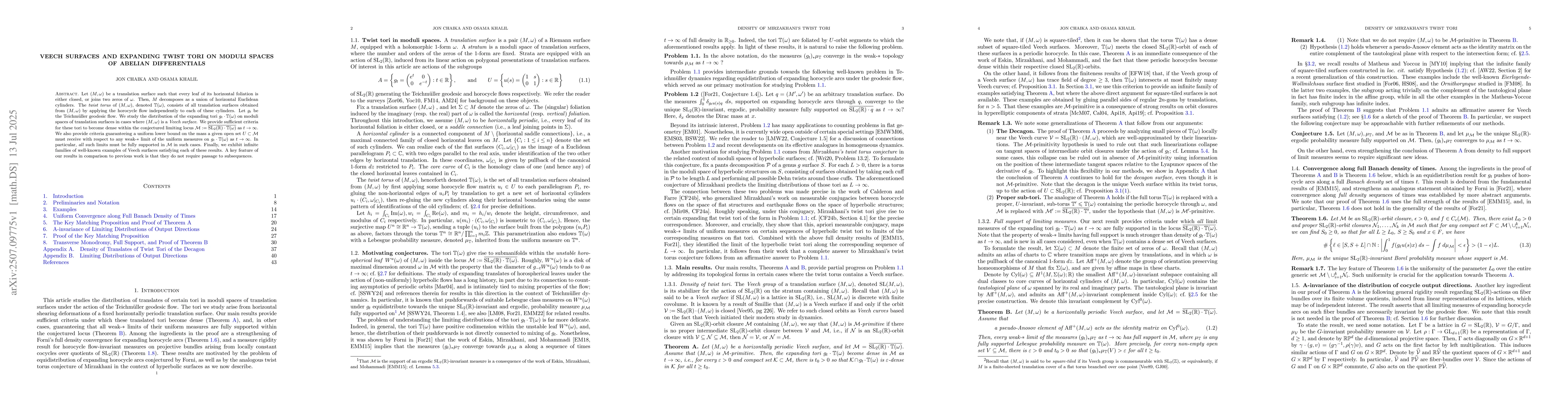 Let $(M,\omega)$ be a translation surface such that every leaf of its horizontal foliation is either closed, or joins two zeros of $\omega$. Then, $M$ decomposes as a union of horizontal Euclidean cylinders. The $\textit{twist torus}$ of $(M,\omega)$, denoted $\mathbb{T}(\omega)$, consists of all translation surfaces obtained from $(M,\omega)$ by applying the horocycle flow independently to each of these cylinders. Let $g_t$ be the Teichm\"uller geodesic flow. We study the distribution of the expanding tori $g_t\cdot \mathbb{T}(\omega)$ on moduli spaces of translation surfaces in cases where $(M,\omega)$ is a $\textit{Veech surface}$. We provide sufficient criteria for these tori to become dense within the conjectured limiting locus $\mathcal{M} :=\overline{\mathrm{SL}_2(\mathbb{R})\cdot \mathbb{T}(\omega)}$ as $t\rightarrow \infty$. We also provide criteria guaranteeing a uniform lower bound on the mass a given open set $U\subset\mathcal{M}$ must receive with respect to any weak-$\ast$ limit of the uniform measures on $g_t\cdot \mathbb{T}(\omega)$ as $t\rightarrow\infty$. In particular, all such limits must be fully supported in $\mathcal{M}$ in such cases. Finally, we exhibit infinite families of well-known examples of Veech surfaces satisfying each of these results. A key feature of our results in comparison to previous work is that they do not require passage to subsequences.