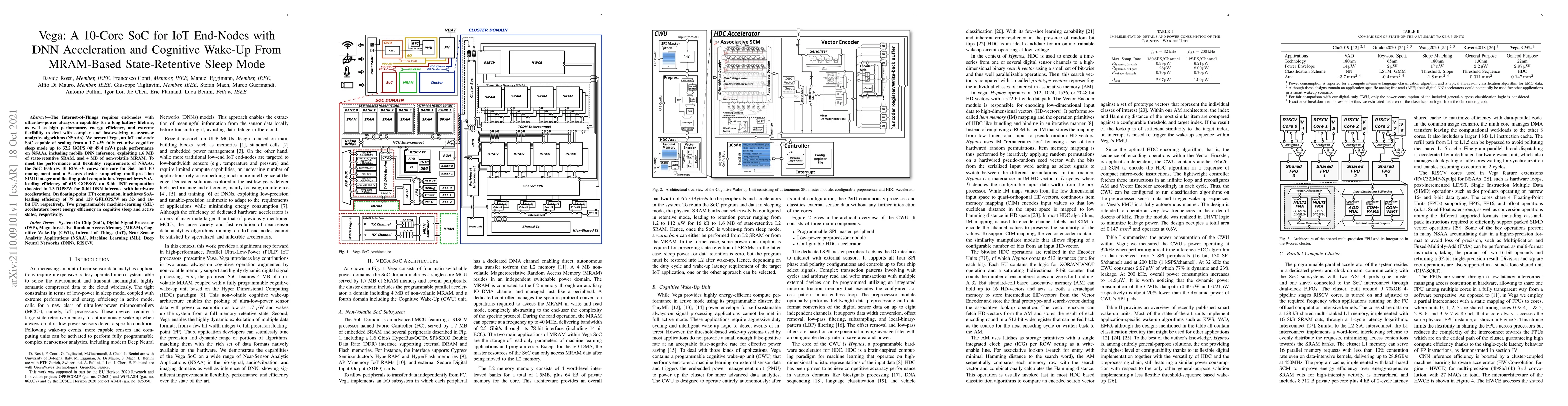 Vega is a 10-core SoC designed for IoT end-nodes, offering ultra-low-power sleep modes and high performance for near-sensor analytics, including DNN inference, with state-retentive MRAM and RISC-V cores. It achieves leading efficiency in both integer and floating-point computations, enhanced by machine-learning accelerators.