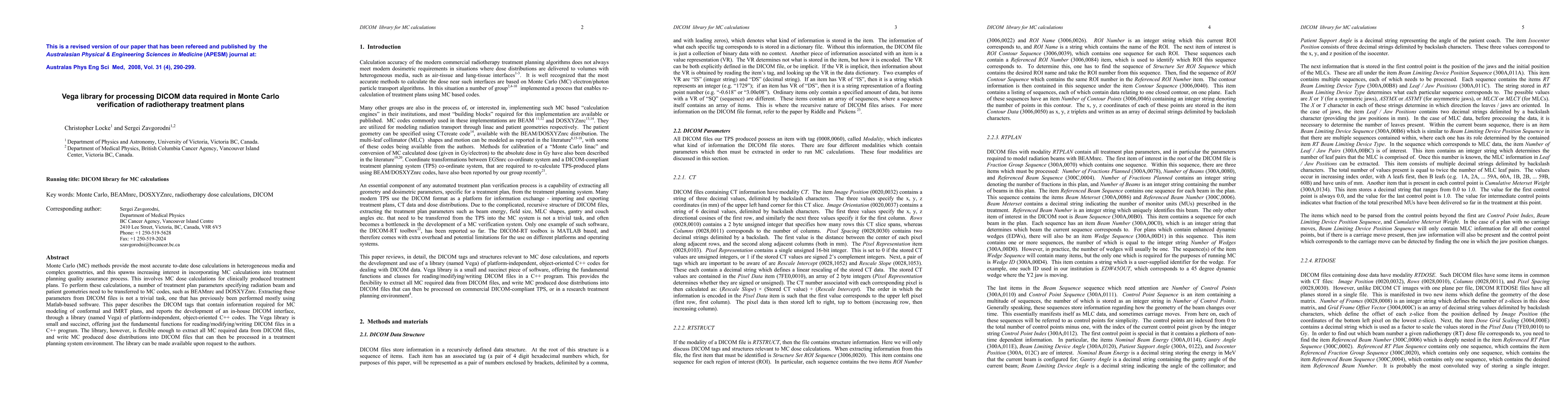 This paper introduces the Vega library, a platform-independent C++ code library designed for processing DICOM data necessary for Monte Carlo (MC) verification of radiotherapy treatment plans. The library facilitates the extraction of treatment plan parameters from DICOM files to be used in MC dose calculations, thus supporting the integration of MC methods into treatment planning quality assurance.