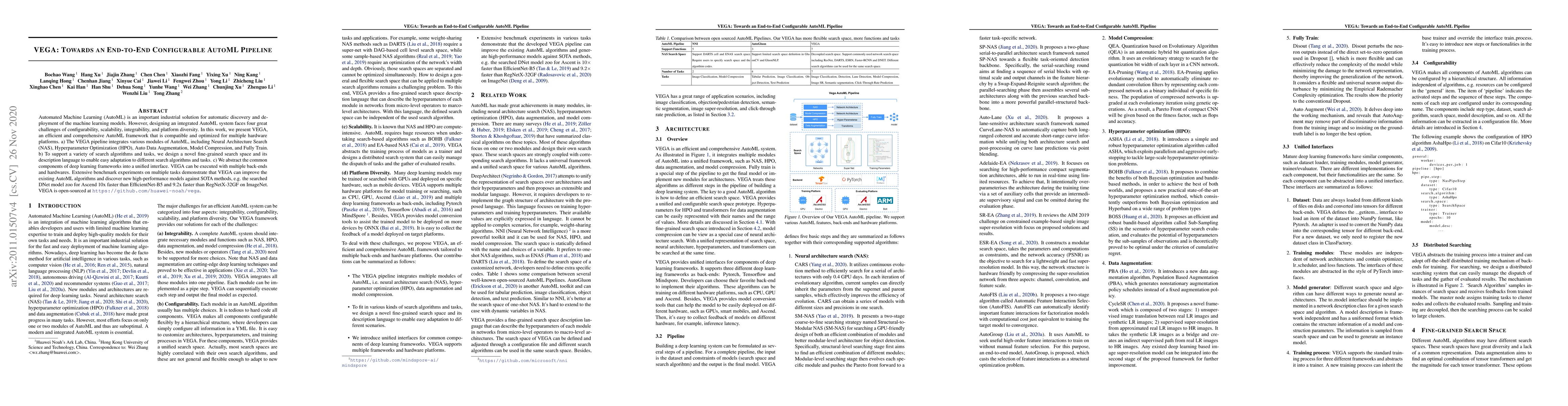 VEGA is an end-to-end configurable AutoML framework designed to tackle the challenges of configurability, scalability, integrability, and platform diversity. It integrates various AutoML modules and supports multiple hardware platforms, demonstrating superior performance in benchmark experiments.