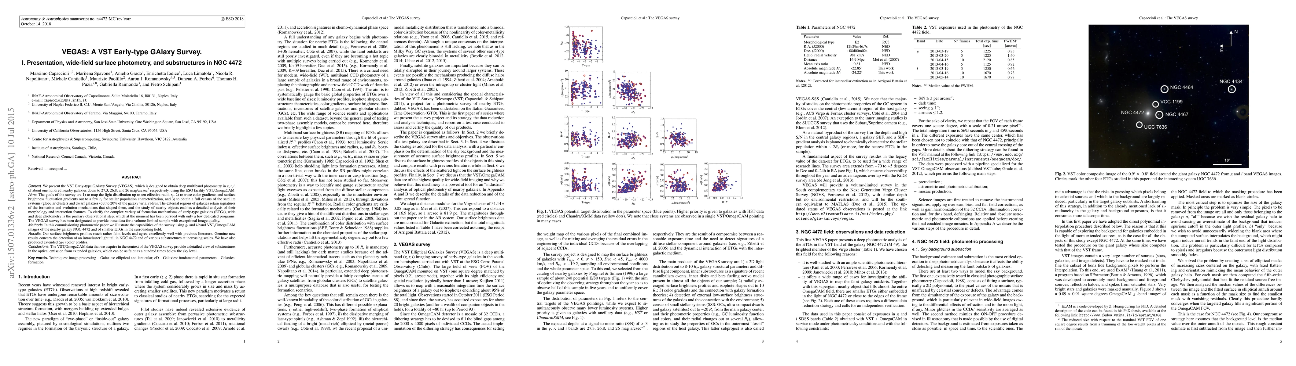 We present the VST Early-type GAlaxy Survey (VEGAS), which is designed to obtain deep multiband photometry in g, r, i, of about one hundred nearby galaxies down to 27.3, 26.8, and 26 mag/arcsec^2 respectively, using the ESO facility VST/OmegaCAM. The goals of the survey are 1) to map the light distribution up to ten effective radii, r_e, 2) to trace color gradients and surface brightness fluctuation gradients out to a few r_e for stellar population characterization, and 3) to obtain a full census of the satellite systems (globular clusters and dwarf galaxies) out to 20% of the galaxy virial radius. The external regions of galaxies retain signatures of the formation and evolution mechanisms that shaped them, and the study of nearby objects enables a detailed analysis of their morphology and interaction features. To clarify the complex variety of formation mechanisms of early-type galaxies (ETGs), wide and deep photometry is the primary observational step, which at the moment has been pursued with only a few dedicated programs. The VEGAS survey has been designated to provide these data for a volume-limited sample with exceptional image quality. In this commissioning photometric paper we illustrate the capabilities of the survey using g- and i-band VST/OmegaCAM images of the nearby galaxy NGC 4472 and of smaller ETGs in the surrounding field. Our surface brightness profiles reach rather faint levels and agree excellently well with previous literature. Genuine new results concern the detection of an intracluster light tail in NGC 4472 and of various substructures at increasing scales. We have also produced extended (g-i) color profiles. The VST/OmegaCAM data that we acquire in the context of the VEGAS survey provide a detailed view of substructures in the optical emission from extended galaxies, which can be as faint as a hundred times below the sky level.