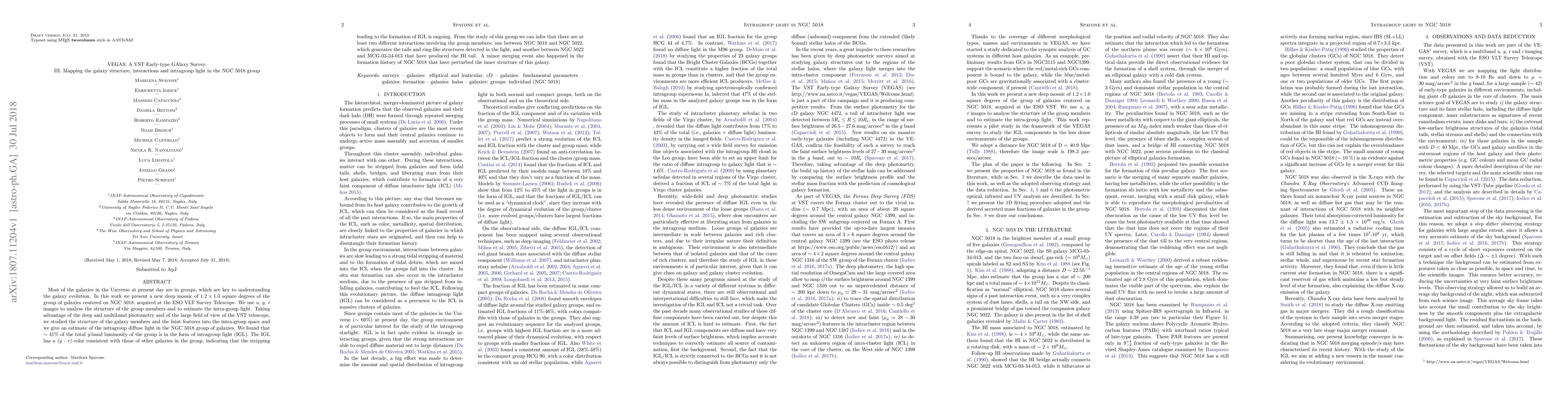 Most of the galaxies in the Universe at present day are in groups, which are key to understanding the galaxy evolution. In this work we present a new deep mosaic of 1.2 x 1.0 square degrees of the group of galaxies centered on NGC 5018, acquired at the ESO VLT Survey Telescope. We use u, g, r images to analyse the structure of the group members and to estimate the intra-group light. Taking advantage of the deep and multiband photometry and of the large field of view of the VST telescope, we studied the structure of the galaxy members and the faint features into the intra-group space and we give an estimate of the intragroup diffuse light in the NGC 5018 group of galaxies. We found that ~ 41% of the total g-band luminosity of the group is in the form of intragroup light (IGL). The IGL has a (g - r) color consistent with those of other galaxies in the group, indicating that the stripping leading to the formation of IGL is ongoing. From the study of this group we can infer that there are at least two different interactions involving the group members: one between NGC 5018 and NGC 5022, which generates the tails and ring-like structures detected in the light, and another between NGC 5022 and MCG-03-34-013 that have produced the HI tail. A minor merging event also happened in the formation history of NGC 5018 that have perturbed the inner structure of this galaxy.
