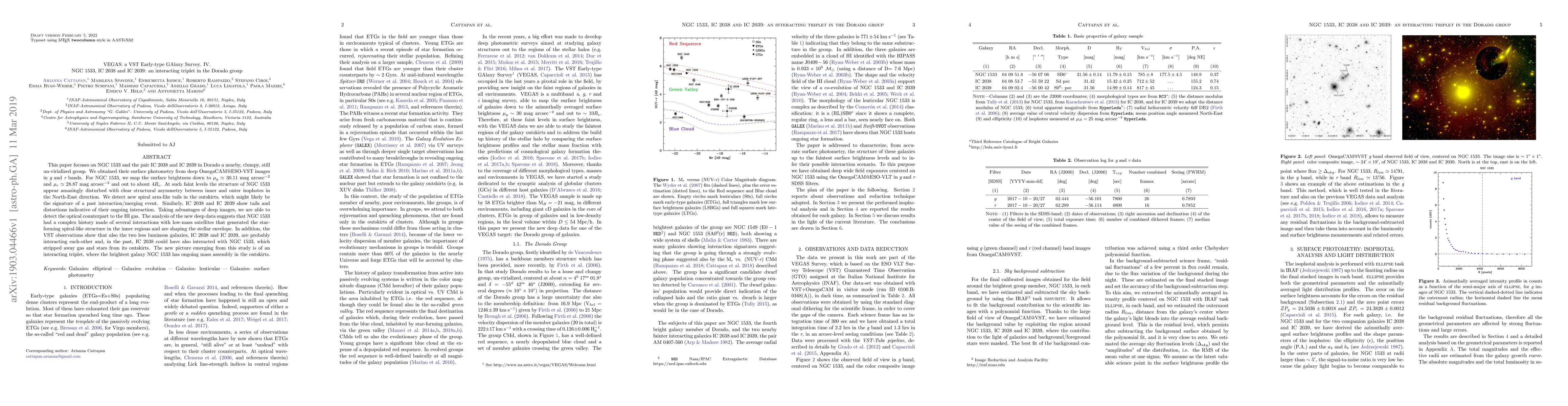 This paper focuses on NGC 1533 and the pair IC 2038 and IC 2039 in Dorado a nearby, clumpy, still un-virialized group. We obtained their surface photometry from deep OmegaCAM@ESO-VST images in g and r bands. For NGC 1533, we map the surface brightness down to $\mu_g \simeq 30.11$ mag/arcsec$^{2}$ and $\mu_r \simeq 28.87$ mag/arcsec$^{2}$ and out to about $4R_e$. At such faint levels the structure of NGC 1533 appear amazingly disturbed with clear structural asymmetry between inner and outer isophotes in the North-East direction. We detect new spiral arm-like tails in the outskirts, which might likely be the signature of a past interaction/merging event. Similarly, IC 2038 and IC 2039 show tails and distortions indicative of their ongoing interaction. Taking advantages of deep images, we are able to detect the optical counterpart to the HI gas. The analysis of the new deep data suggests that NGC 1533 had a complex history made of several interactions with low-mass satellites that generated the star-forming spiral-like structure in the inner regions and are shaping the stellar envelope. In addition, the VST observations show that also the two less luminous galaxies, IC 2038 and IC 2039, are probably interacting each-other and, in the past, IC 2038 could have also interacted with NGC 1533, which stripped away gas and stars from its outskirts. The new picture emerging from this study is of an interacting triplet, where the brightest galaxy NGC 1533 has ongoing mass assembly in the outskirts.