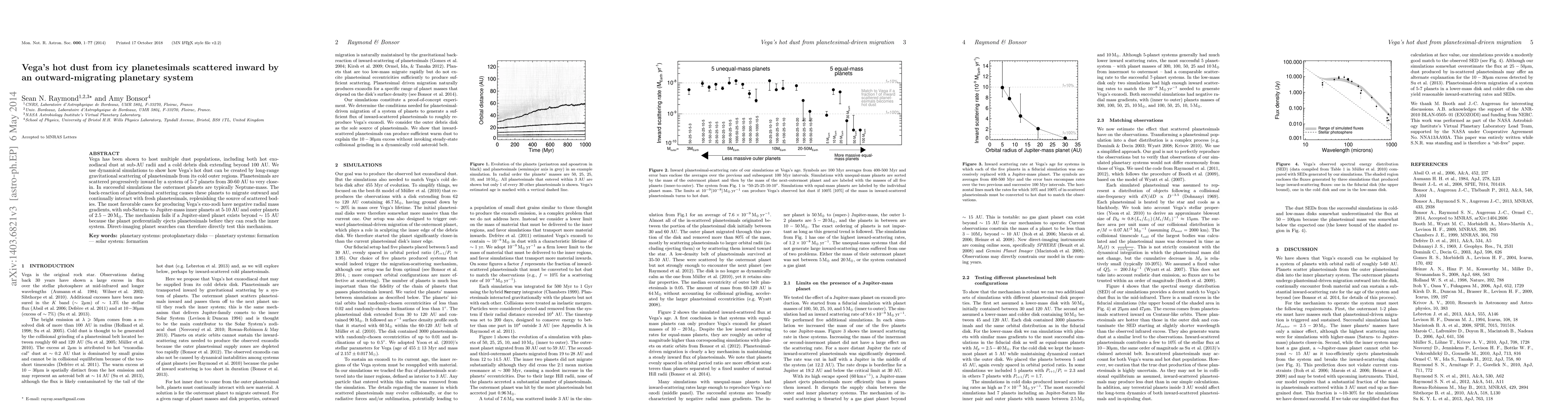 This paper demonstrates that Vega's hot dust can originate from icy planetesimals scattered inward by a system of 5-7 migrating planets, with Neptune-mass outer planets driving the scattering. The presence of sub-Saturn to Jupiter-mass inner planets and outer planets of 2.5 to 20 Earth masses favors this mechanism, which can be tested via direct-imaging planet searches.