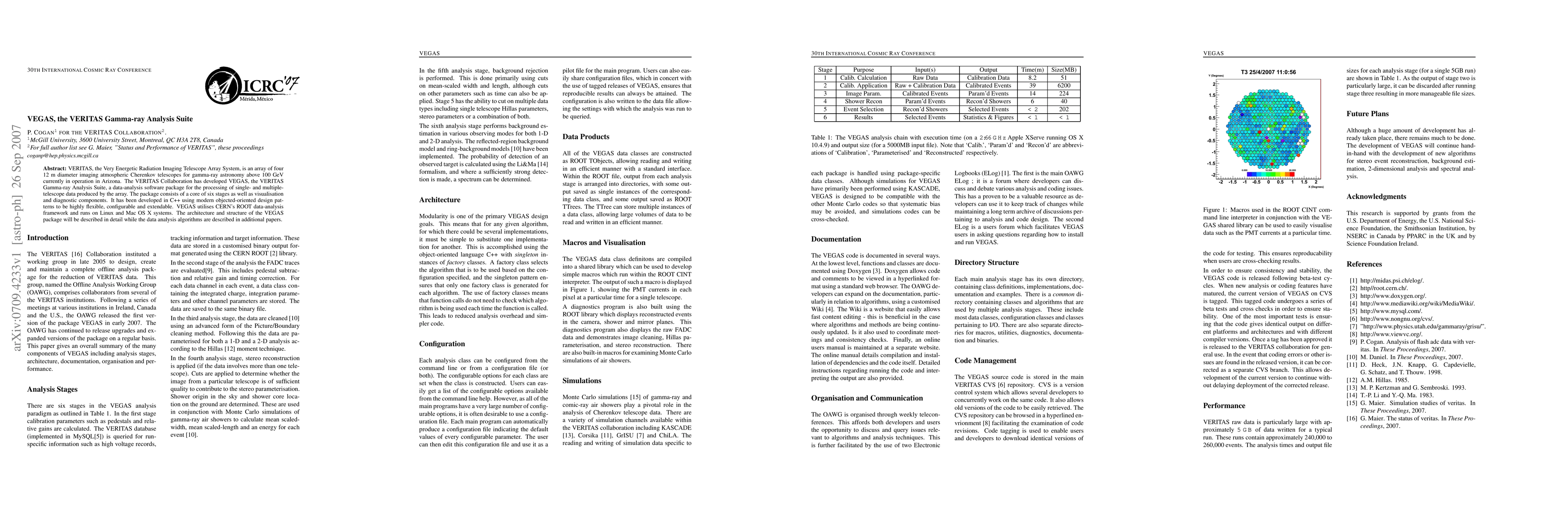 VEGAS is a sophisticated data-analysis software suite developed by the VERITAS Collaboration for processing gamma-ray data from the VERITAS telescope array. It is designed in C++ with object-oriented principles, utilizing CERN's ROOT framework and supporting Linux and Mac OS X systems.