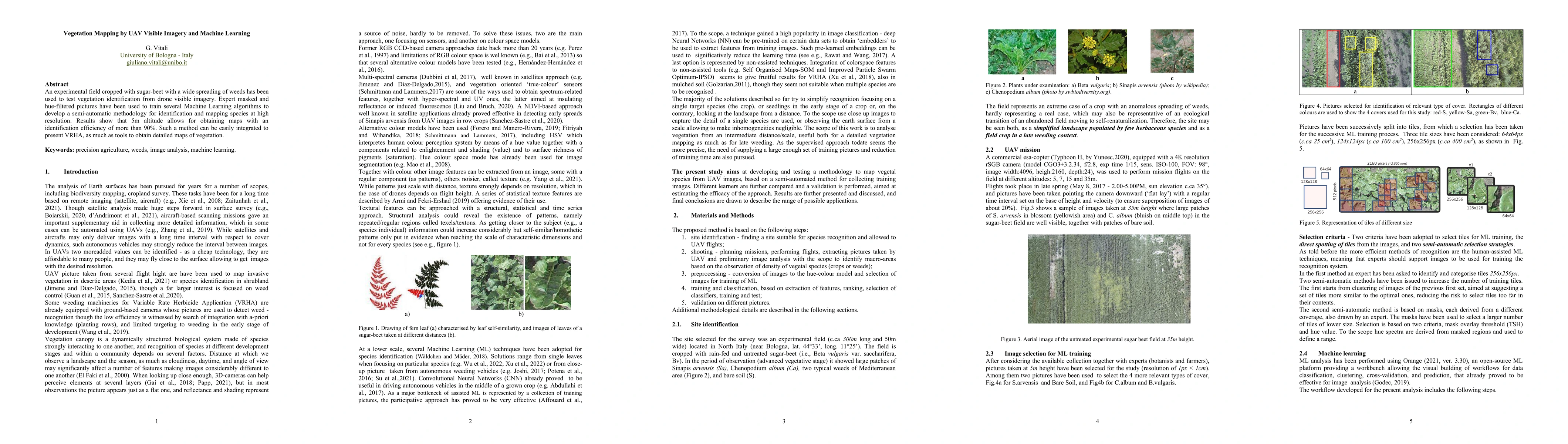 An experimental field cropped with sugar-beet with a wide spreading of weeds has been used to test vegetation identification from drone visible imagery. Expert masked and hue-filtered pictures have been used to train several Machine Learning algorithms to develop a semi-automatic methodology for identification and mapping species at high resolution. Results show that 5m altitude allows for obtaining maps with an identification efficiency of more than 90%. Such a method can be easily integrated to present VRHA, as much as tools to obtain detailed maps of vegetation.