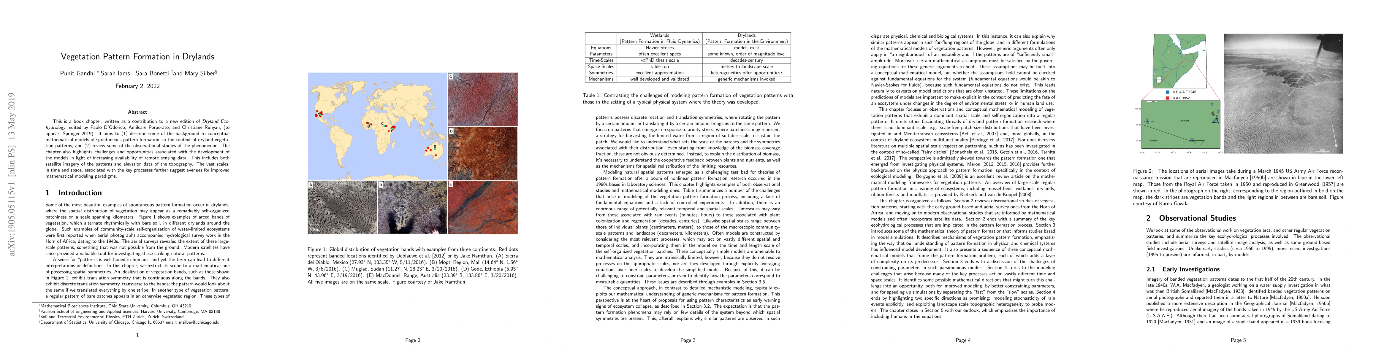 This chapter explores the formation of vegetation patterns in drylands through conceptual mathematical models and observational studies, emphasizing the challenges and opportunities presented by remote sensing data and the need for improved modeling paradigms to address the vast temporal and spatial scales involved.