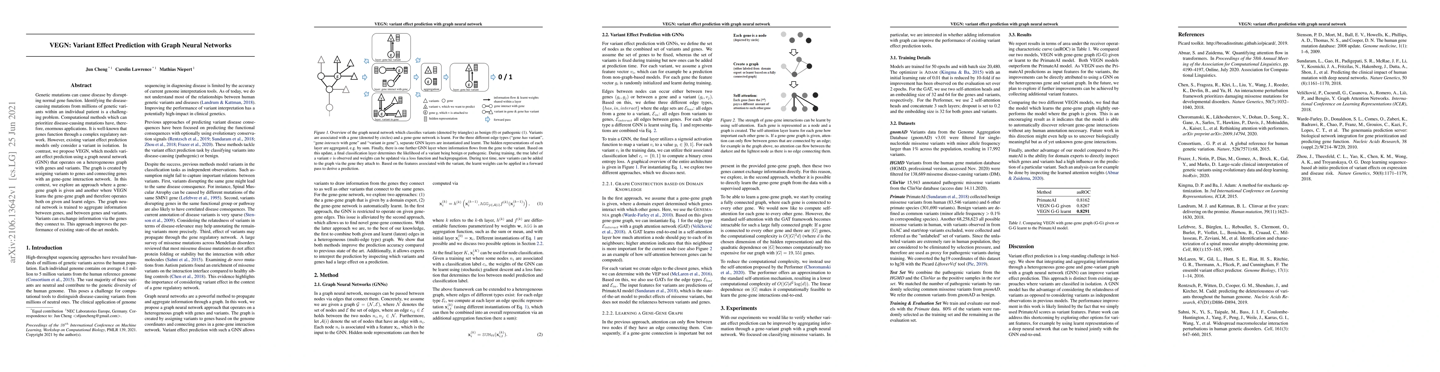 Genetic mutations can cause disease by disrupting normal gene function. Identifying the disease-causing mutations from millions of genetic variants within an individual patient is a challenging problem. Computational methods which can prioritize disease-causing mutations have, therefore, enormous applications. It is well-known that genes function through a complex regulatory network. However, existing variant effect prediction models only consider a variant in isolation. In contrast, we propose VEGN, which models variant effect prediction using a graph neural network (GNN) that operates on a heterogeneous graph with genes and variants. The graph is created by assigning variants to genes and connecting genes with an gene-gene interaction network. In this context, we explore an approach where a gene-gene graph is given and another where VEGN learns the gene-gene graph and therefore operates both on given and learnt edges. The graph neural network is trained to aggregate information between genes, and between genes and variants. Variants can exchange information via the genes they connect to. This approach improves the performance of existing state-of-the-art models.