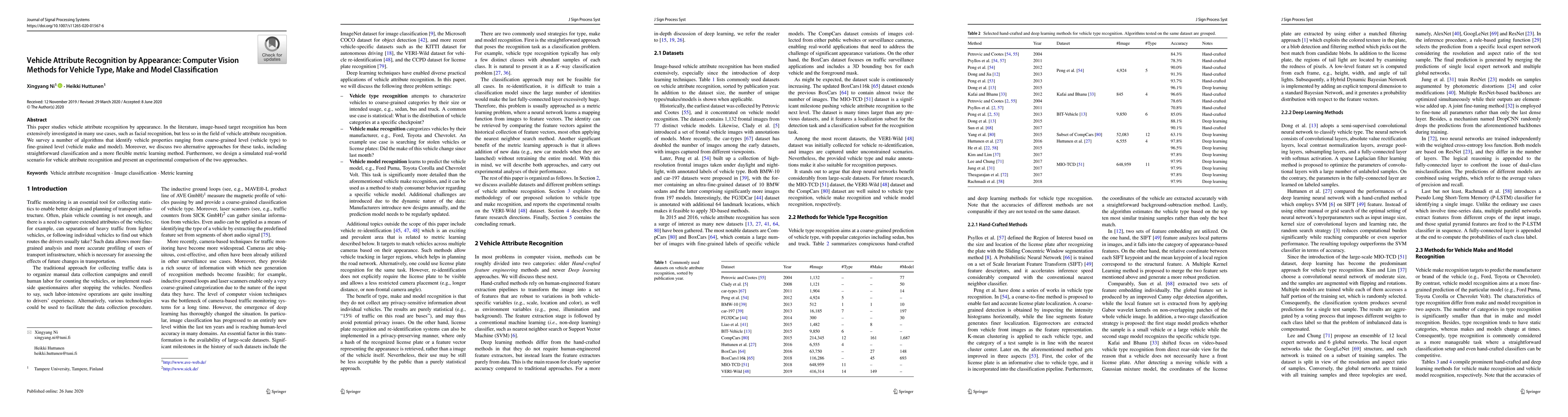 This paper surveys computer vision methods for classifying vehicle attributes by appearance, ranging from type to make and model, and compares straightforward classification with metric learning approaches in a simulated real-world scenario. Experimental results highlight the effectiveness of the proposed metric learning method.