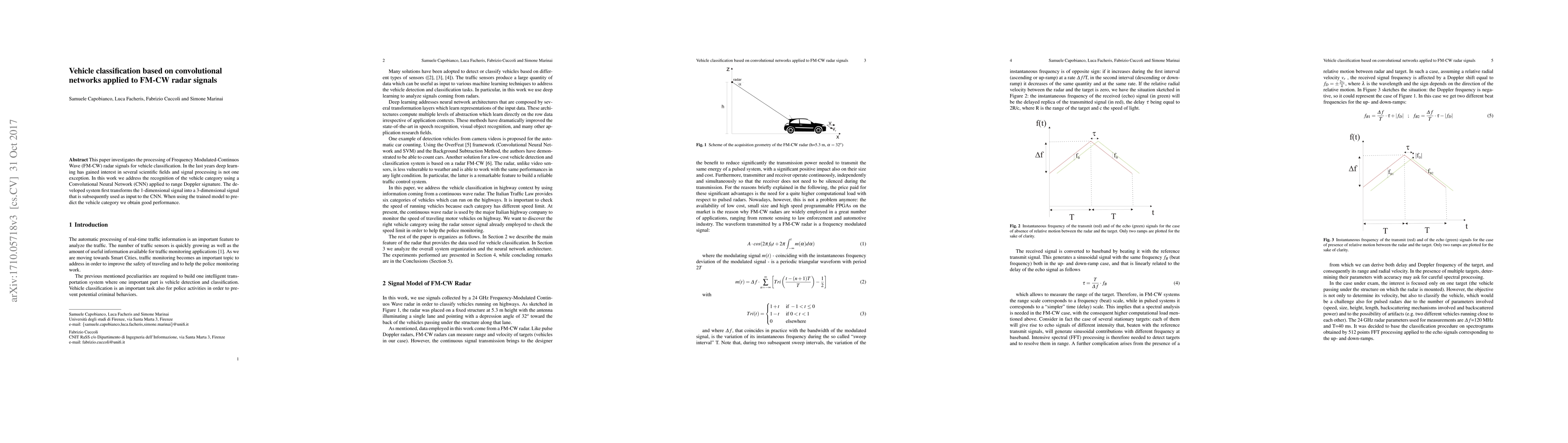 This paper explores the use of Convolutional Neural Networks (CNNs) for classifying vehicles based on Frequency Modulated-Continuous Wave (FM-CW) radar signals. The system transforms 1-D radar signals into 3-D inputs for the CNN, achieving good classification performance.