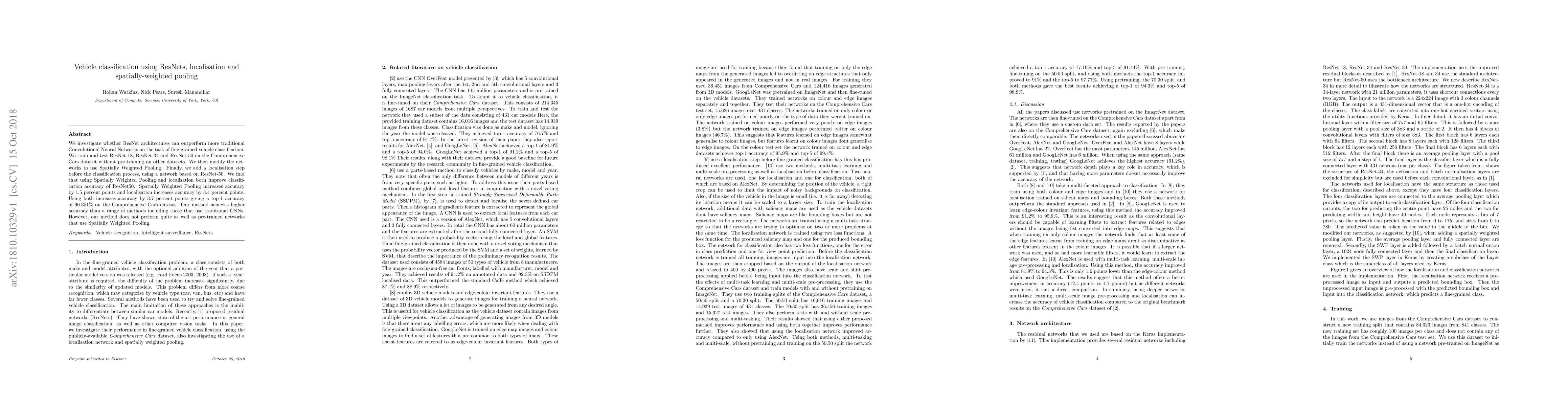 We investigate whether ResNet architectures can outperform more traditional Convolutional Neural Networks on the task of fine-grained vehicle classification. We train and test ResNet-18, ResNet-34 and ResNet-50 on the Comprehensive Cars dataset without pre-training on other datasets. We then modify the networks to use Spatially Weighted Pooling. Finally, we add a localisation step before the classification process, using a network based on ResNet-50. We find that using Spatially Weighted Pooling and localisation both improve classification accuracy of ResNet50. Spatially Weighted Pooling increases accuracy by 1.5 percent points and localisation increases accuracy by 3.4 percent points. Using both increases accuracy by 3.7 percent points giving a top-1 accuracy of 96.351\% on the Comprehensive Cars dataset. Our method achieves higher accuracy than a range of methods including those that use traditional CNNs. However, our method does not perform quite as well as pre-trained networks that use Spatially Weighted Pooling.