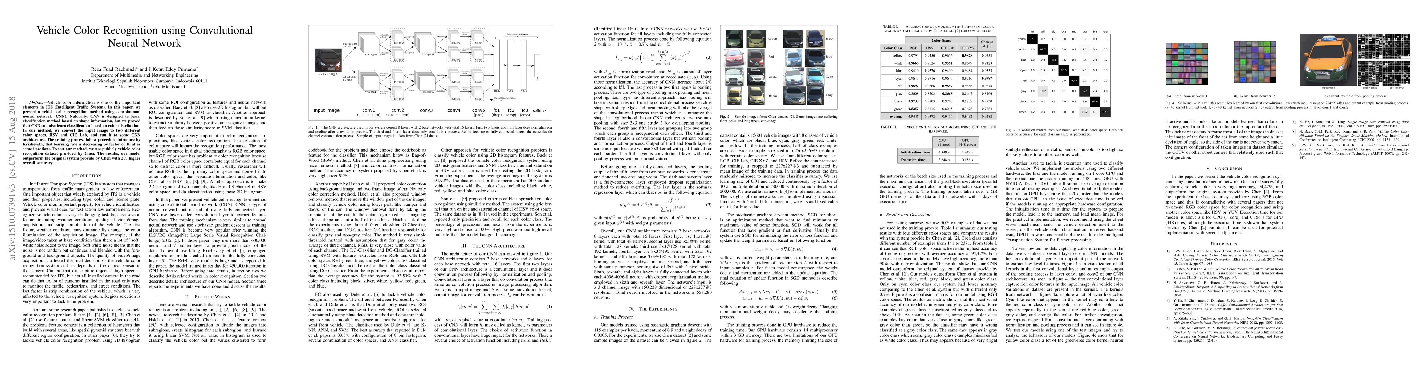This paper proposes a vehicle color recognition method using a convolutional neural network (CNN) that demonstrates improved accuracy over existing systems by learning classification based on color distribution. The method converts input images to HSV and CIE Lab color spaces and trains the CNN with a learning rate schedule, achieving a 2% higher overall accuracy than the original dataset benchmark.