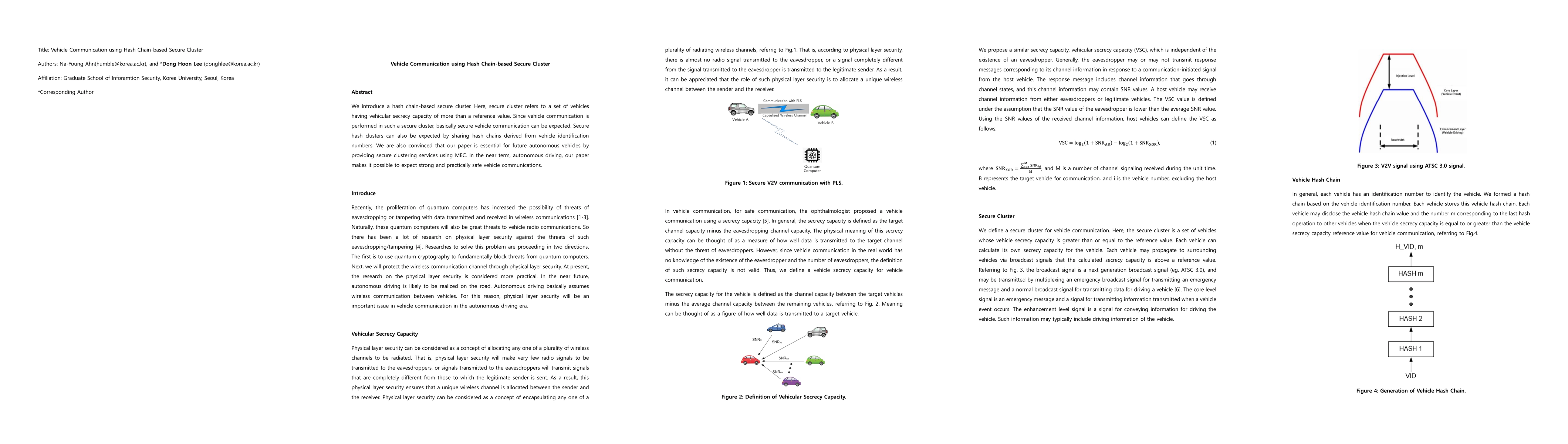 We introduce a hash chain-based secure cluster. Here, secure cluster refers to a set of vehicles having vehicular secrecy capacity of more than a reference value. Since vehicle communication is performed in such a secure cluster, basically secure vehicle communication can be expected. Secure hash clusters can also be expected by sharing hash chains derived from vehicle identification numbers. We are also convinced that our paper is essential for future autonomous vehicles by providing secure clustering services using MEC. In the near term, autonomous driving, our paper makes it possible to expect strong and practically safe vehicle communications.