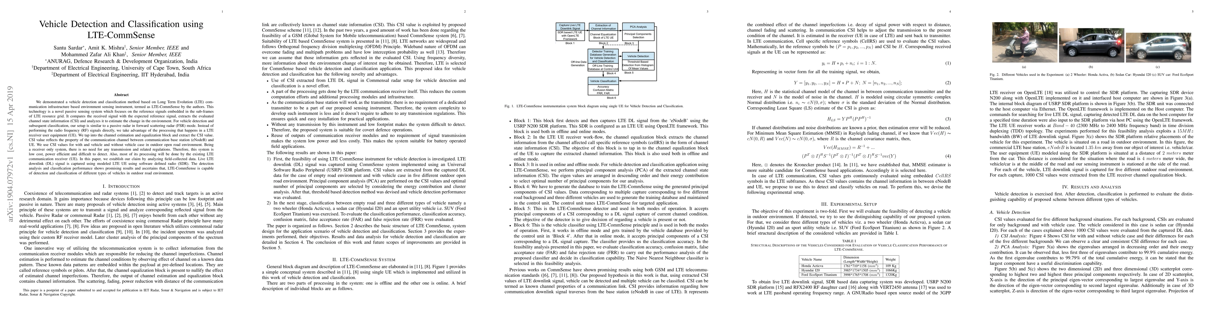 This paper presents a novel passive vehicle detection and classification method using LTE-CommSense, which leverages embedded reference signals in LTE communication infrastructure to extract channel state information (CSI) for environment analysis. The system demonstrates promising results in detecting and classifying vehicles in outdoor settings, utilizing existing LTE receivers without requiring additional transmission, thus offering low cost and power efficiency.