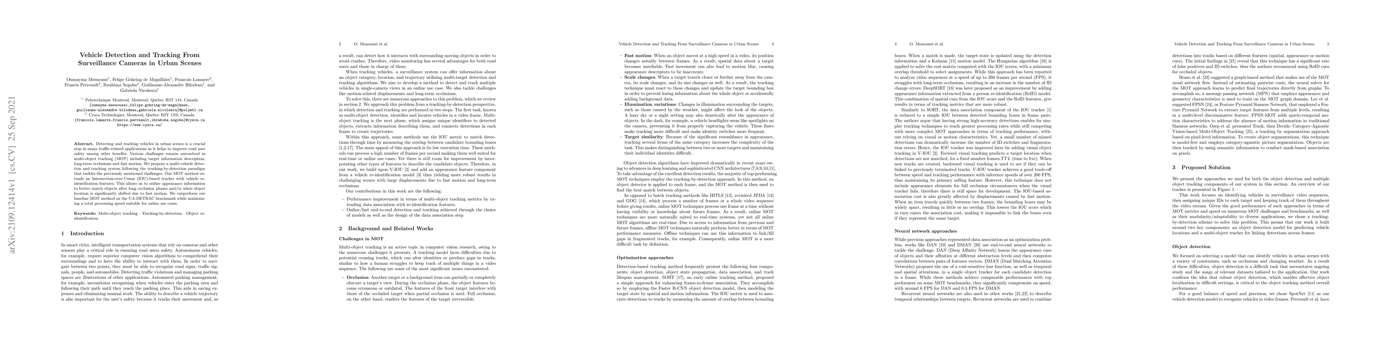 Detecting and tracking vehicles in urban scenes is a crucial step in many traffic-related applications as it helps to improve road user safety among other benefits. Various challenges remain unresolved in multi-object tracking (MOT) including target information description, long-term occlusions and fast motion. We propose a multi-vehicle detection and tracking system following the tracking-by-detection paradigm that tackles the previously mentioned challenges. Our MOT method extends an Intersection-over-Union (IOU)-based tracker with vehicle re-identification features. This allows us to utilize appearance information to better match objects after long occlusion phases and/or when object location is significantly shifted due to fast motion. We outperform our baseline MOT method on the UA-DETRAC benchmark while maintaining a total processing speed suitable for online use cases.