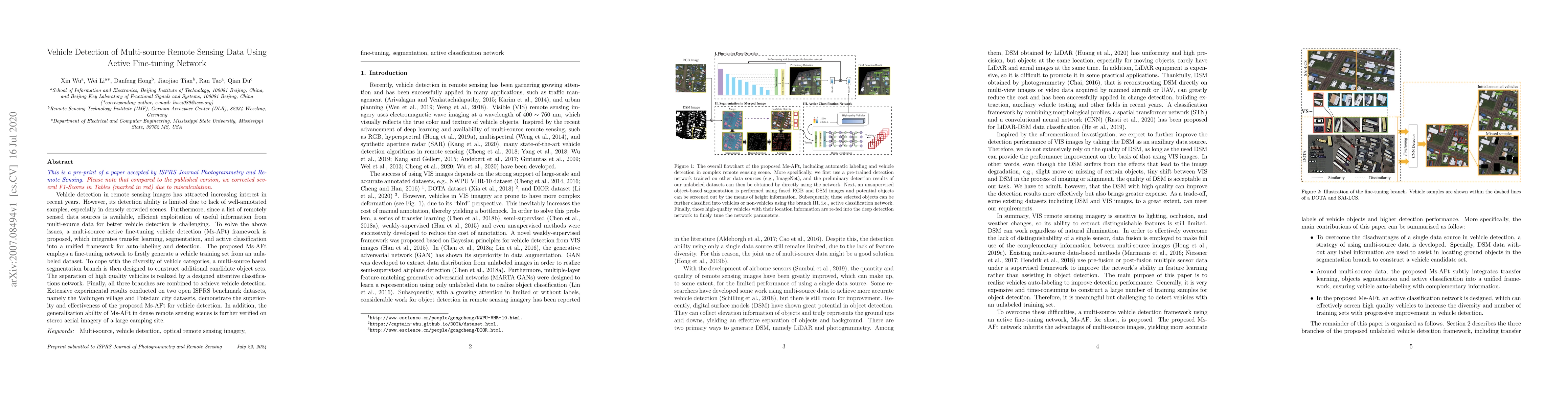 The paper proposes a multi-source active fine-tuning network (Ms-AFt) for vehicle detection in remote sensing images, leveraging transfer learning and segmentation to auto-label and detect vehicles from unlabeled datasets. Experiments on ISPRS benchmark datasets show the framework's effectiveness and generalization in dense scenes.