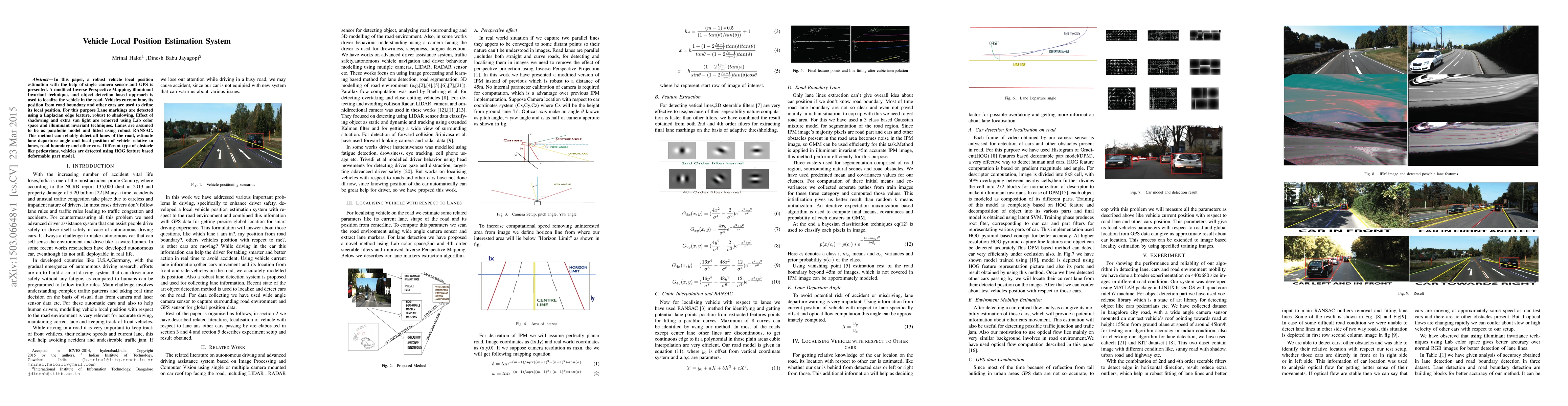 In this paper, a robust vehicle local position estimation with the help of single camera sensor and GPS is presented. A modified Inverse Perspective Mapping, illuminant Invariant techniques and object detection based approach is used to localize the vehicle in the road. Vehicles current lane, its position from road boundary and other cars are used to define its local position. For this purpose Lane markings are detected using a Laplacian edge feature, robust to shadowing. Effect of shadowing and extra sun light are removed using Lab color space and illuminant invariant techniques. Lanes are assumed to be as parabolic model and fitted using robust RANSAC. This method can reliably detect all lanes of the road, estimate lane departure angle and local position of vehicle relative to lanes, road boundary and other cars. Different type of obstacle like pedestrians, vehicles are detected using HOG feature based deformable part model.