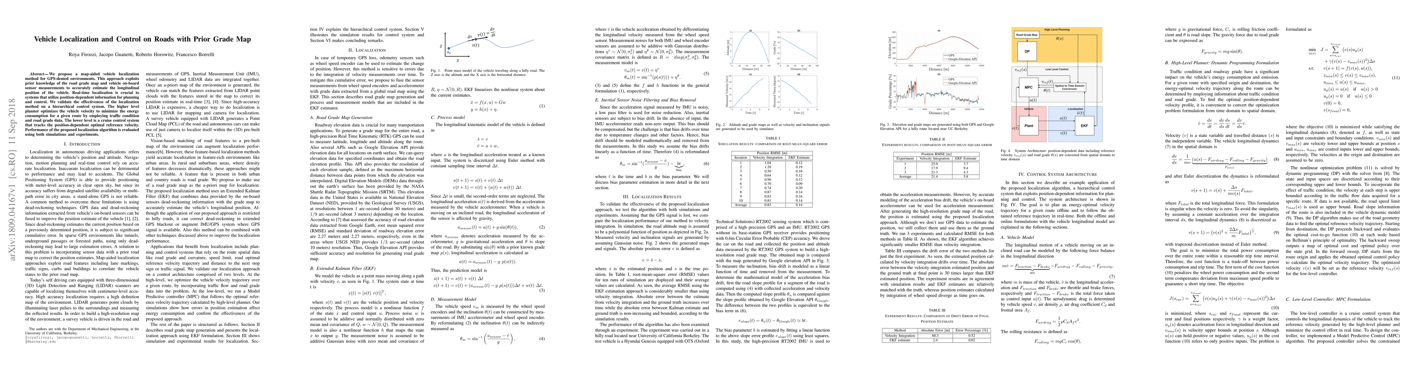 We propose a map-aided vehicle localization method for GPS-denied environments. This approach exploits prior knowledge of the road grade map and vehicle on-board sensor measurements to accurately estimate the longitudinal position of the vehicle. Real-time localization is crucial to systems that utilize position-dependent information for planning and control. We validate the effectiveness of the localization method on a hierarchical control system. The higher level planner optimizes the vehicle velocity to minimize the energy consumption for a given route by employing traffic condition and road grade data. The lower level is a cruise control system that tracks the position-dependent optimal reference velocity. Performance of the proposed localization algorithm is evaluated using both simulations and experiments.