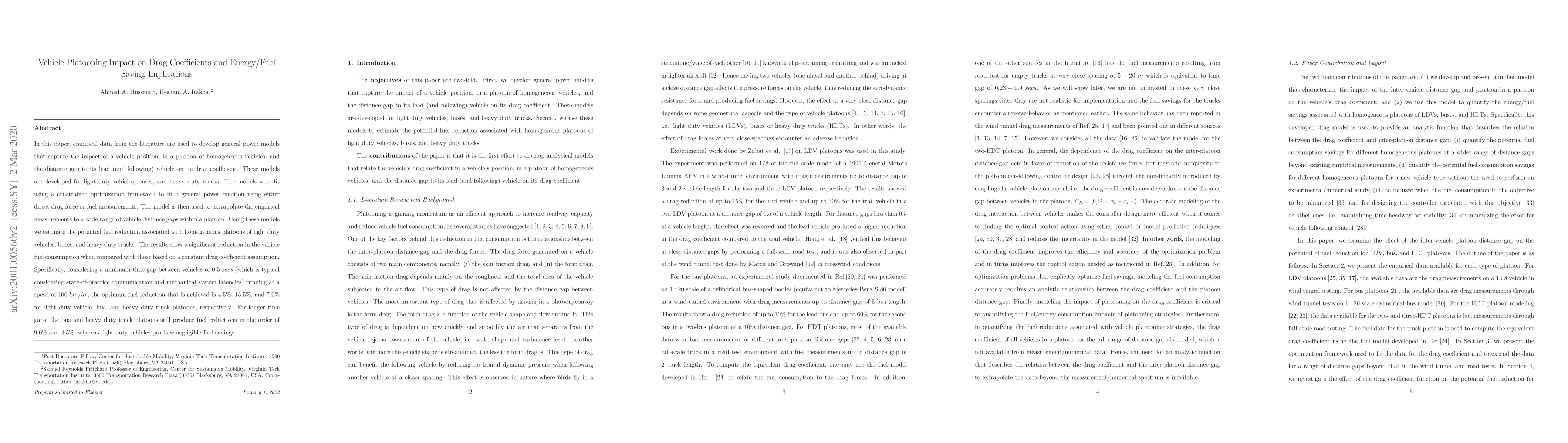 In this paper, empirical data from the literature are used to develop general power models that capture the impact of a vehicle position, in a platoon of homogeneous vehicles, and the distance gap to its lead (and following) vehicle on its drag coefficient. These models are developed for light duty vehicles, buses, and heavy duty trucks. The models were fit using a constrained optimization framework to fit a general power function using either direct drag force or fuel measurements. The model is then used to extrapolate the empirical measurements to a wide range of vehicle distance gaps within a platoon. Using these models we estimate the potential fuel reduction associated with homogeneous platoons of light duty vehicles, buses, and heavy duty trucks. The results show a significant reduction in the vehicle fuel consumption when compared with those based on a constant drag coefficient assumption. Specifically, considering a minimum time gap between vehicles of $0.5 \; secs$ (which is typical considering state-of-practice communication and mechanical system latencies) running at a speed of $100 \; km/hr$, the optimum fuel reduction that is achieved is $4.5 \%$, $15.5 \%$, and $7.0 \%$ for light duty vehicle, bus, and heavy duty truck platoons, respectively. For longer time gaps, the bus and heavy duty truck platoons still produce fuel reductions in the order of $9.0 \%$ and $4.5 \%$, whereas light duty vehicles produce negligible fuel savings.