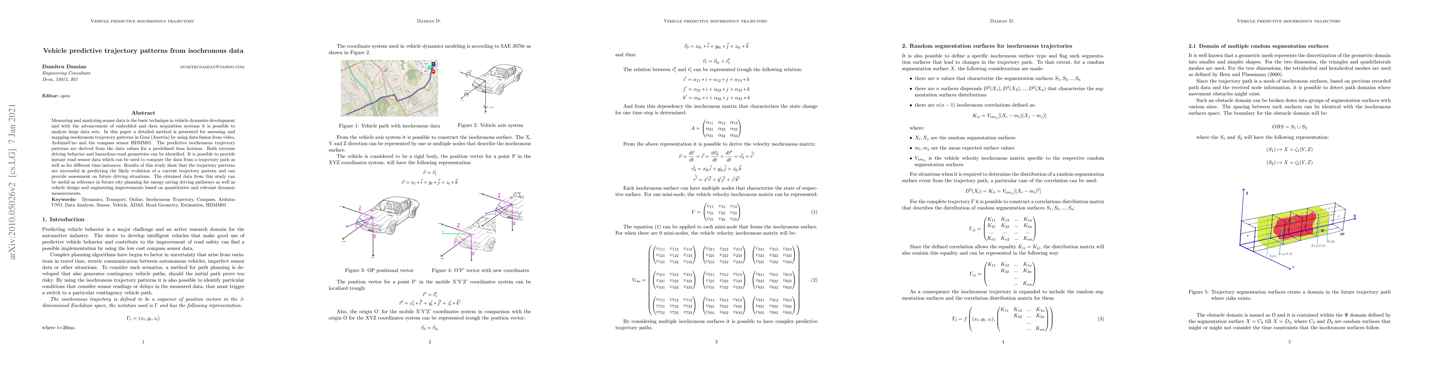 Measuring and analyzing sensor data is the basic technique in vehicle dynamics development and with the advancement of embedded and data acquisition systems it is possible to analyze large data sets. In this paper a detailed method is presented for assessing and mapping isochronous trajectory patterns in Graz (Austria) by using data fusion from video, ArduinoUno and the compass sensor HDMM01. The predictive isochronous trajectory patterns are derived from the data values for a predefined time horizon. Both extreme driving behavior and hazardous road geometries can be identified. It is possible to provide instant road sensor data which can be used to compare the data from a trajectory path as well as for different time instances. Results of this study show that the trajectory patterns are successful in predicting the likely evolution of a current trajectory pattern and can provide assessment on future driving situations. The obtained data from this study can be useful as reference in future city planning for energy saving driving pathways as well as vehicle design and engineering improvements based on quantitative and relevant dynamic measurements.