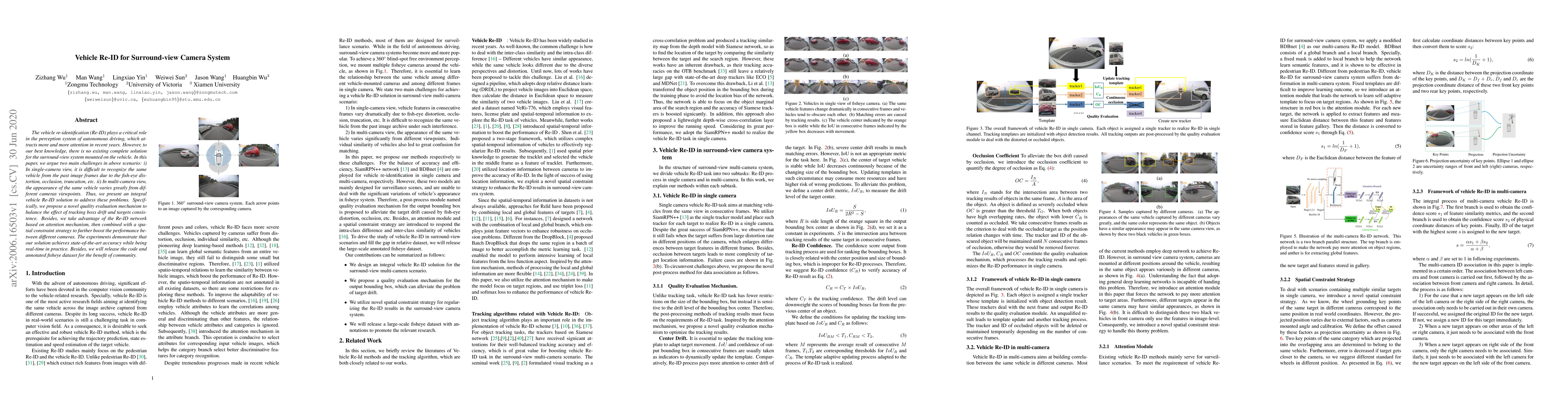 This paper proposes a novel vehicle re-identification solution for a surround-view camera system, addressing challenges of fisheye distortion and varying appearances across multiple cameras. The method includes a quality evaluation mechanism and a Re-ID network with an attention mechanism, achieving state-of-the-art accuracy in real-time.