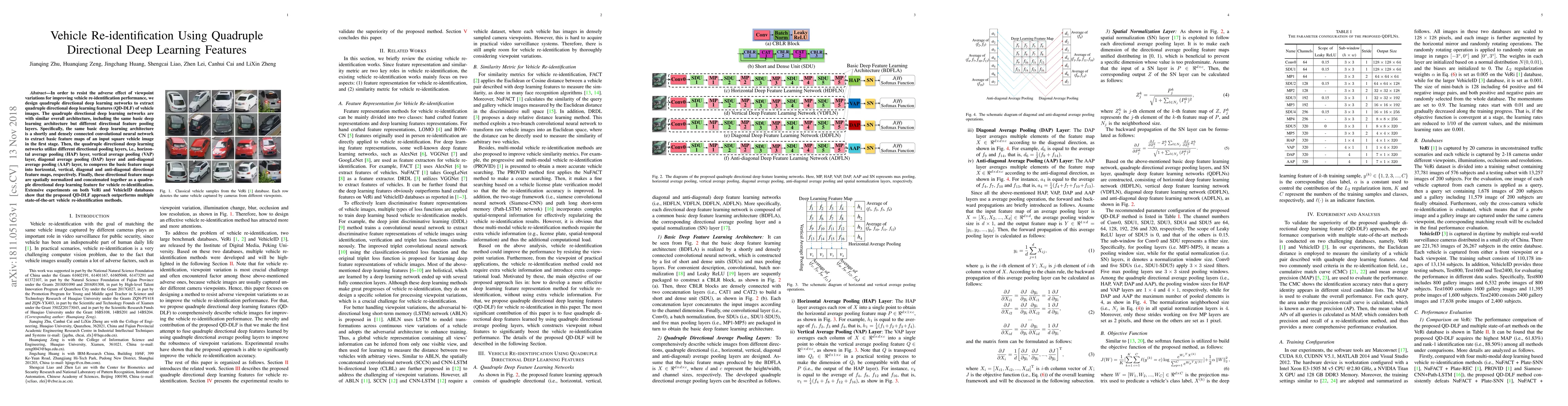 This paper proposes quadruple directional deep learning networks for vehicle re-identification, utilizing different directional pooling layers to extract horizontal, vertical, diagonal, and anti-diagonal features. The method outperforms existing state-of-the-art techniques on VeRi and VehicleID datasets.