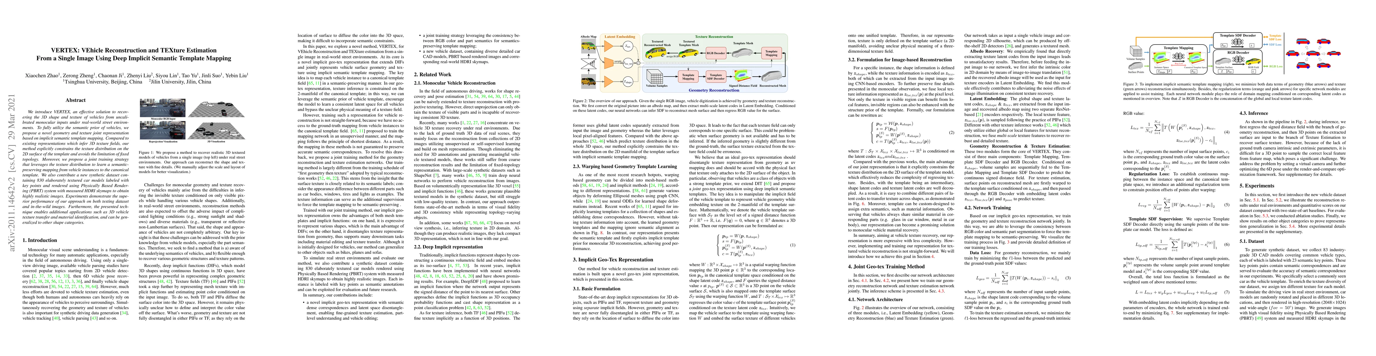 We introduce VERTEX, an effective solution to recover 3D shape and intrinsic texture of vehicles from uncalibrated monocular input in real-world street environments. To fully utilize the template prior of vehicles, we propose a novel geometry and texture joint representation, based on implicit semantic template mapping. Compared to existing representations which infer 3D texture distribution, our method explicitly constrains the texture distribution on the 2D surface of the template as well as avoids limitations of fixed resolution and topology. Moreover, by fusing the global and local features together, our approach is capable to generate consistent and detailed texture in both visible and invisible areas. We also contribute a new synthetic dataset containing 830 elaborate textured car models labeled with sparse key points and rendered using Physically Based Rendering (PBRT) system with measured HDRI skymaps to obtain highly realistic images. Experiments demonstrate the superior performance of our approach on both testing dataset and in-the-wild images. Furthermore, the presented technique enables additional applications such as 3D vehicle texture transfer and material identification.