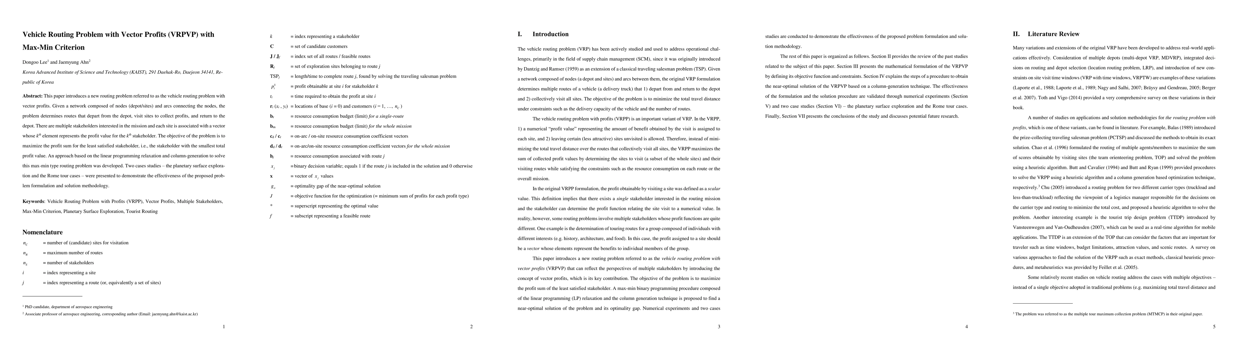 This paper introduces a new routing problem called Vehicle Routing Problem with Vector Profits (VRPVP), which aims to maximize profit for the least satisfied stakeholder while visiting sites in a network.