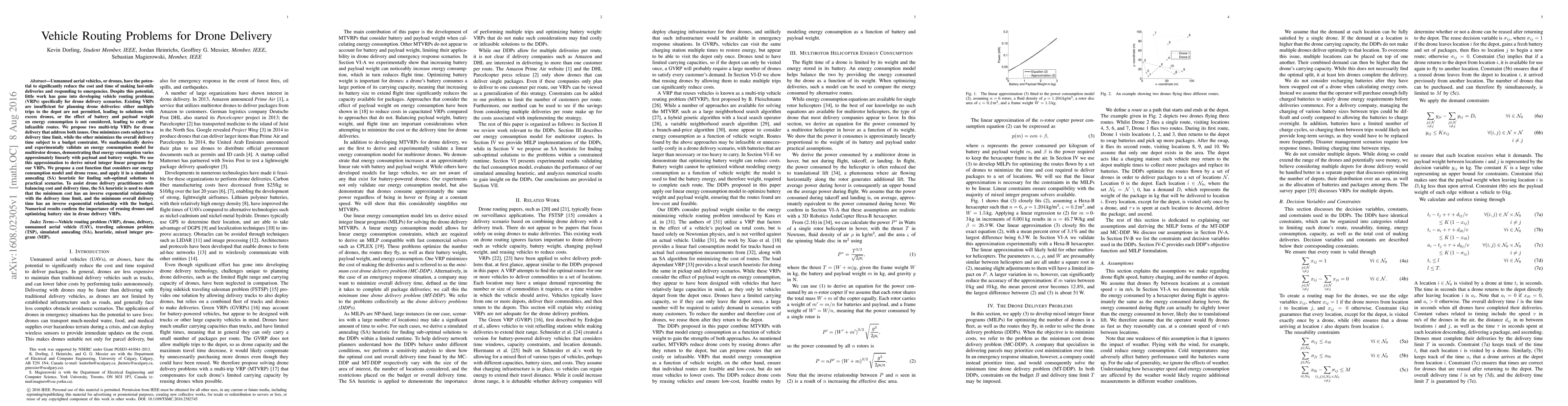 This paper proposes two multi-trip vehicle routing problems (VRPs) tailored for drone delivery, addressing issues with existing VRPs by allowing multiple trips and considering battery and payload weight. The authors develop an energy consumption model and use it to derive mixed integer linear programs, applying a simulated annealing heuristic to find sub-optimal solutions, which demonstrates the importance of drone reuse and battery optimization in balancing cost and delivery time.