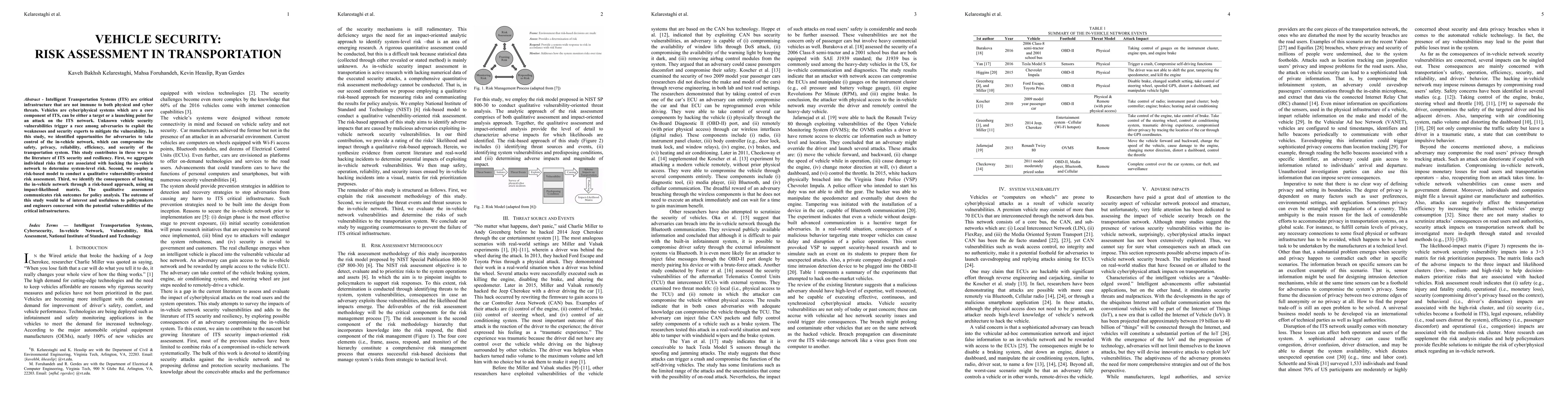 Intelligent Transportation Systems (ITS) are critical infrastructure that are not immune to both physical and cyber threats. Vehicles are cyber/physical systems which are a core component of ITS, can be either a target or a launching point for an attack on the ITS network. Unknown vehicle security vulnerabilities trigger a race among adversaries to exploit the weaknesses and security experts to mitigate the vulnerability. In this study, we identified opportunities for adversaries to take control of the in-vehicle network, which can compromise the safety, privacy, reliability, efficiency, and security of the transportation system. This study contributes in three ways to the literature of ITS security and resiliency. First, we aggregate individual risks that are associated with hacking the in-vehicle network to determine system-level risk. Second, we employ a risk-based model to conduct a qualitative vulnerability-oriented risk assessment. Third, we identify the consequences of hacking the in-vehicle network through a risk-based approach, using an impact-likelihood matrix. The qualitative assessment communicates risk outcomes for policy analysis. The outcome of this study would be of interest and usefulness to policymakers and engineers concerned with the potential vulnerabilities of the critical infrastructures.