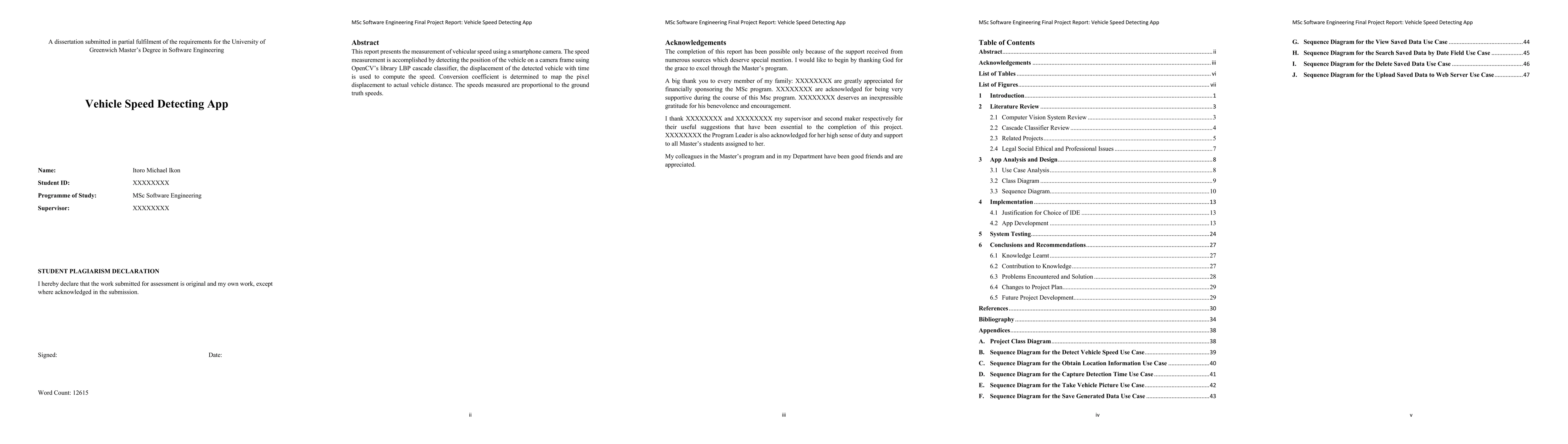 The report presents the measurement of vehicular speed using a smartphone camera. The speed measurement is accomplished by detecting the position of the vehicle on a camera frame using the LBP cascade classifier of OpenCV API, the displacement of the detected vehicle with time is used to compute the speed. Conversion coefficient is determined to map the pixel displacement to actual vehicle distance. The speeds measured are proportional to the ground truth speeds.