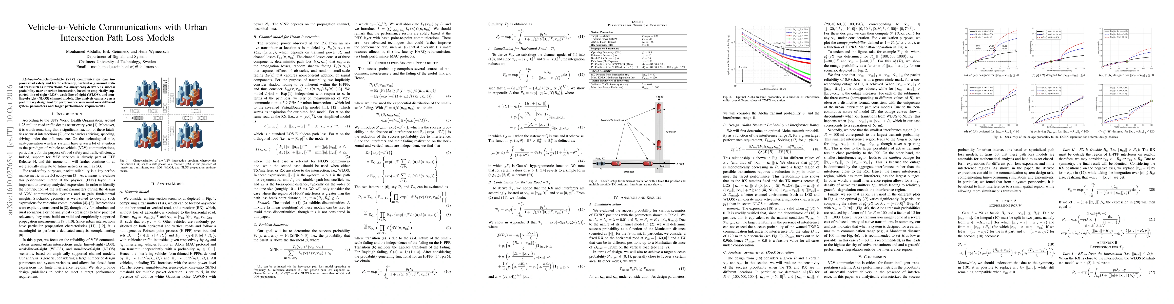 This paper analytically derives V2V communication success probability near urban intersections using LOS, WLOS, and NLOS channel models, providing a preliminary design tool for assessing performance under various system parameters.