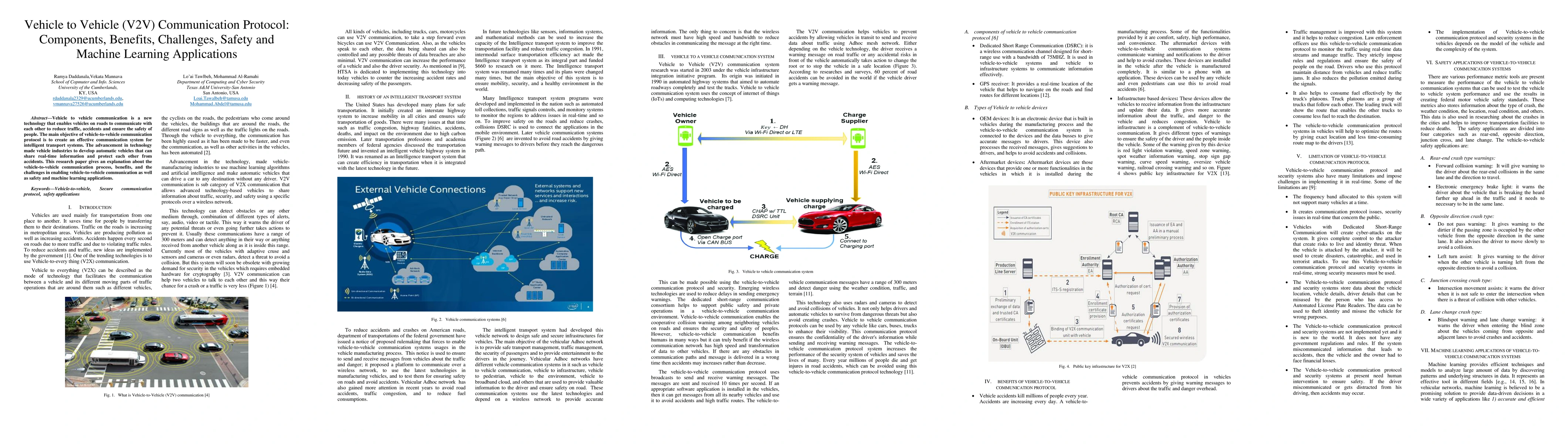 This paper explores the components, benefits, and challenges of Vehicle-to-Vehicle (V2V) communication protocols, emphasizing their role in enhancing road safety and traffic efficiency, while also discussing potential applications in machine learning for intelligent transport systems.