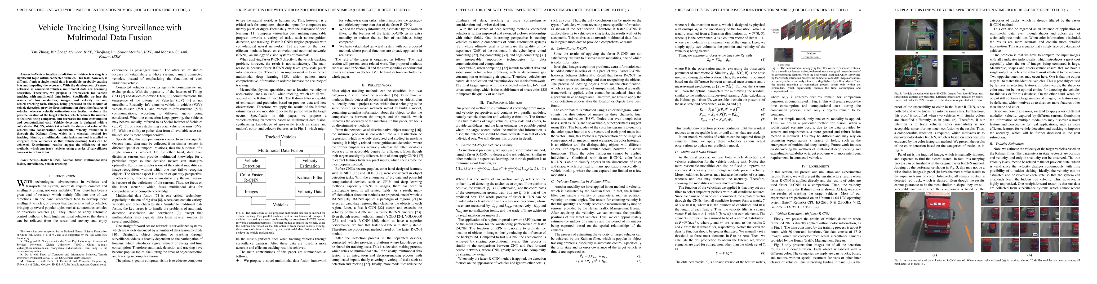 This paper proposes a vehicle tracking framework using multimodal data fusion, combining image-based vehicle detection and velocity estimation. The method integrates results from color-faster R-CNN for vehicle detection and Kalman filter for velocity estimation to achieve accurate and efficient vehicle tracking in urban surveillance.