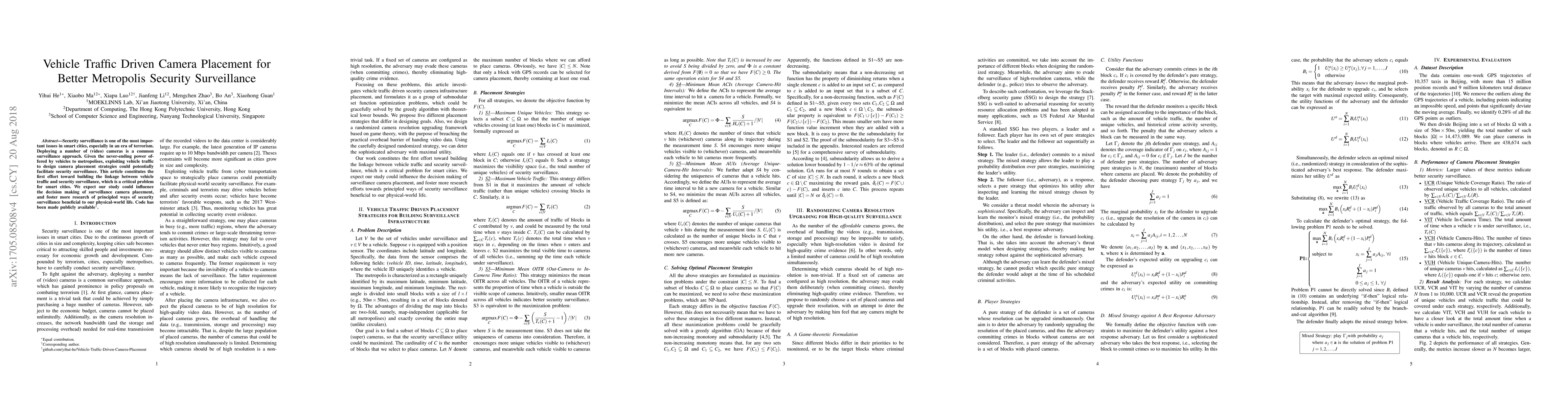 Security surveillance is one of the most important issues in smart cities, especially in an era of terrorism. Deploying a number of (video) cameras is a common surveillance approach. Given the never-ending power offered by vehicles to metropolises, exploiting vehicle traffic to design camera placement strategies could potentially facilitate security surveillance. This article constitutes the first effort toward building the linkage between vehicle traffic and security surveillance, which is a critical problem for smart cities. We expect our study could influence the decision making of surveillance camera placement, and foster more research of principled ways of security surveillance beneficial to our physical-world life. Code has been made publicly available.