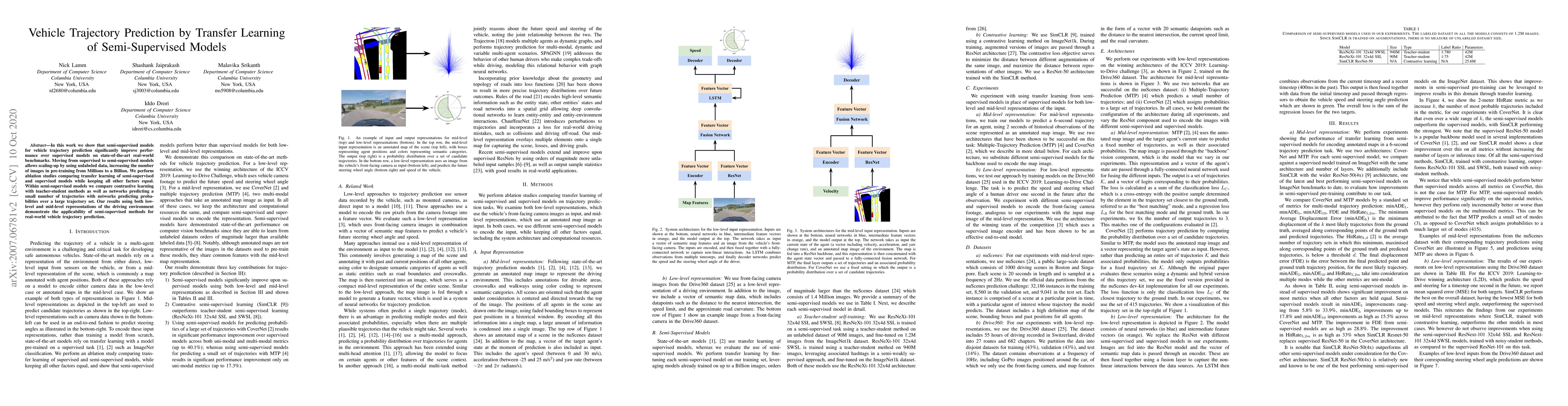 In this work we show that semi-supervised models for vehicle trajectory prediction significantly improve performance over supervised models on state-of-the-art real-world benchmarks. Moving from supervised to semi-supervised models allows scaling-up by using unlabeled data, increasing the number of images in pre-training from Millions to a Billion. We perform ablation studies comparing transfer learning of semi-supervised and supervised models while keeping all other factors equal. Within semi-supervised models we compare contrastive learning with teacher-student methods as well as networks predicting a small number of trajectories with networks predicting probabilities over a large trajectory set. Our results using both low-level and mid-level representations of the driving environment demonstrate the applicability of semi-supervised methods for real-world vehicle trajectory prediction.