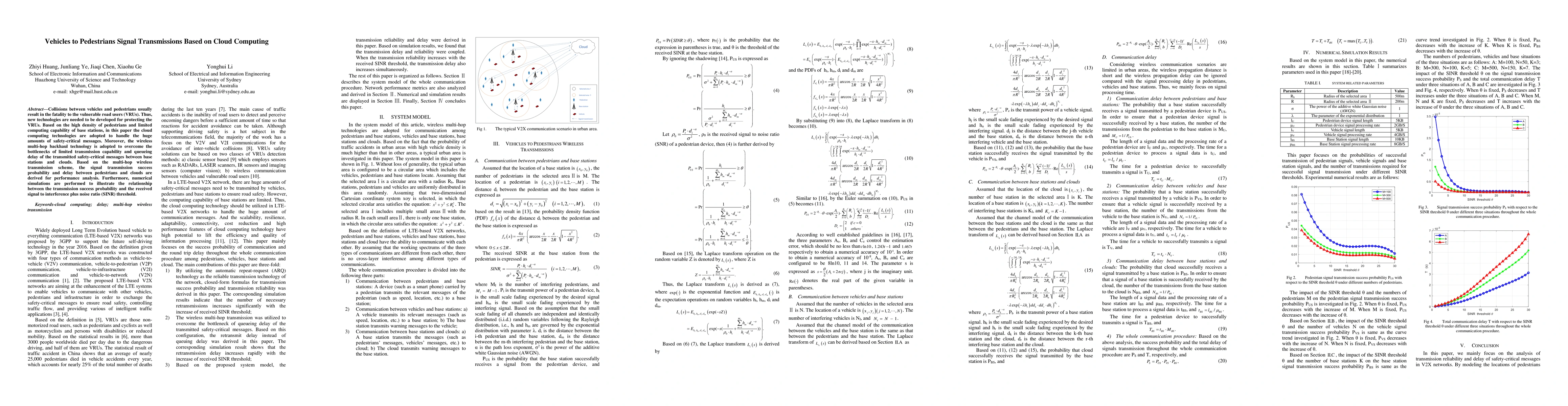 Collisions between vehicles and pedestrians usually result in the fatality to the vulnerable road users (VRUs). Thus, new technologies are needed to be developed for protecting the VRUs. Based on the high density of pedestrians and limited computing capability of base stations, in this paper the cloud computing technologies are adopted to handle the huge amounts of safety-critical messages. Moreover, the wireless multi-hop backhaul technology is adopted to overcome the bottlenecks of limited transmission capability and queueing delay of the transmitted safety-critical messages between base stations and clouds. Based on the multi-hop wireless transmission scheme, the signal transmission success probability and delay between pedestrians and clouds are derived for performance analysis. Furthermore, numerical simulations are performed to illustrate the relationship between the transmission success probability and the received signal to interference plus noise ratio (SINR) threshold.