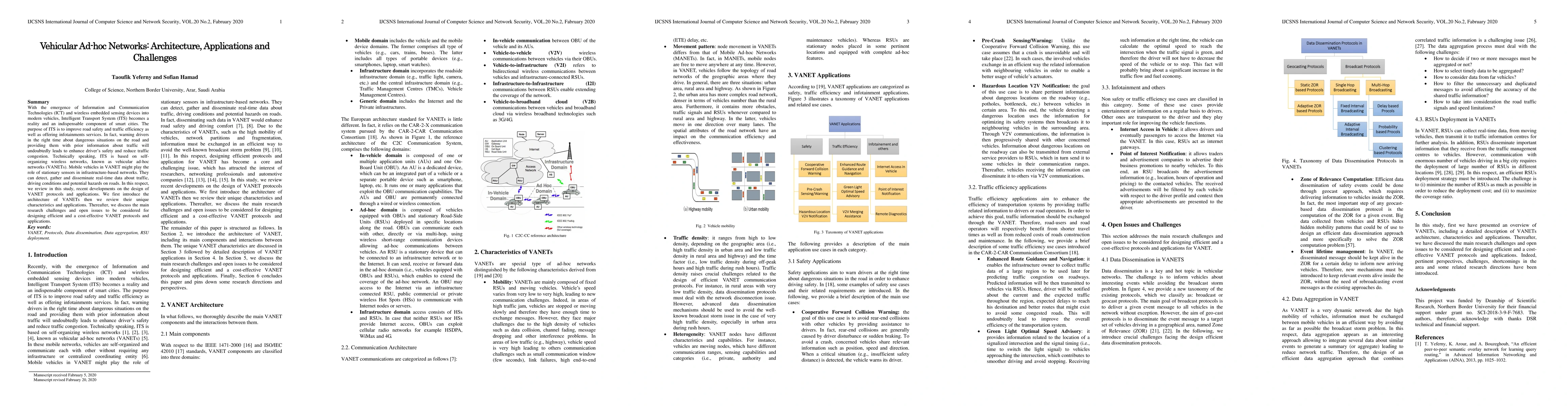 This paper reviews the architecture, applications, and challenges of vehicular ad-hoc networks (VANETs), which enable Intelligent Transport Systems (ITS) to enhance road safety and traffic efficiency through real-time data dissemination among vehicles. It also discusses the main research challenges in designing efficient and cost-effective VANET protocols and applications.