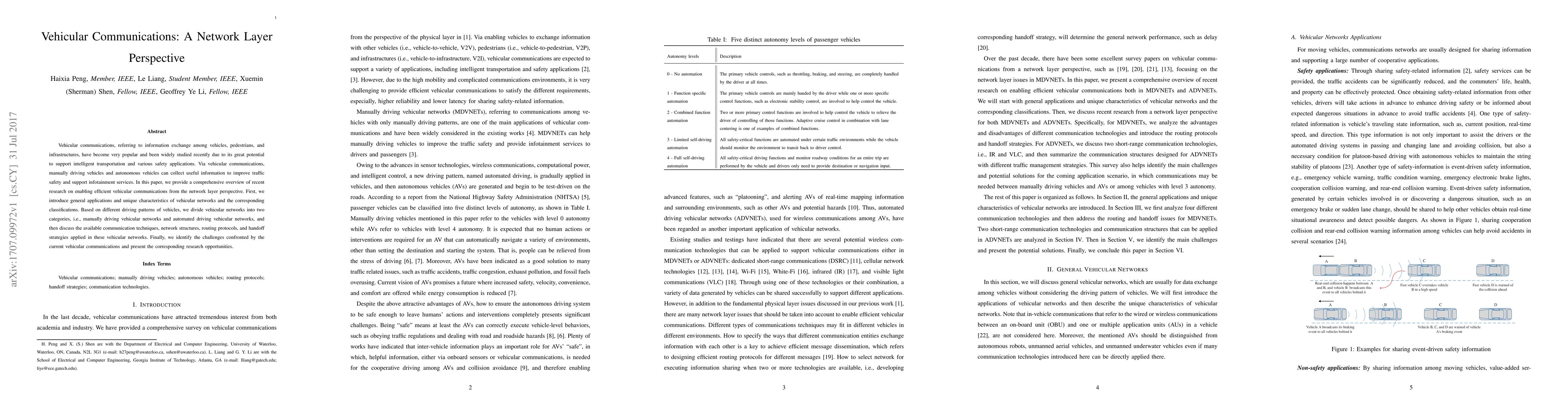 Vehicular communications, referring to information exchange among vehicles, pedestrians, and infrastructures, have become very popular and been widely studied recently due to its great potential to support intelligent transportation and various safety applications. Via vehicular communications, manually driving vehicles and autonomous vehicles can collect useful information to improve traffic safety and support infotainment services. In this paper, we provide a comprehensive overview of recent research on enabling efficient vehicular communications from the network layer perspective. First, we introduce general applications and unique characteristics of vehicular networks and the corresponding classifications. Based on different driving patterns of vehicles, we divide vehicular networks into two categories, i.e., manually driving vehicular networks and automated driving vehicular networks, and then discuss the available communication techniques, network structures, routing protocols, and handoff strategies applied in these vehicular networks. Finally, we identify the challenges confronted by the current vehicular communications and present the corresponding research opportunities.