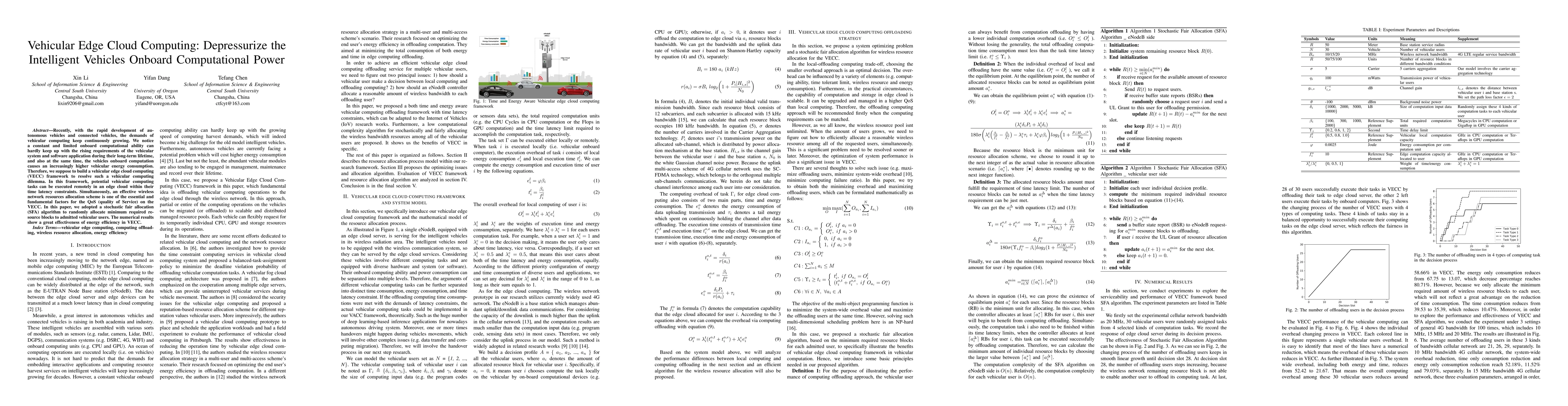This paper proposes a vehicular edge cloud computing (VECC) framework to alleviate the computational and energy burdens on autonomous and connected vehicles. It introduces a stochastic fair allocation (SFA) algorithm to efficiently allocate wireless network resources, demonstrating significant improvements in energy efficiency.