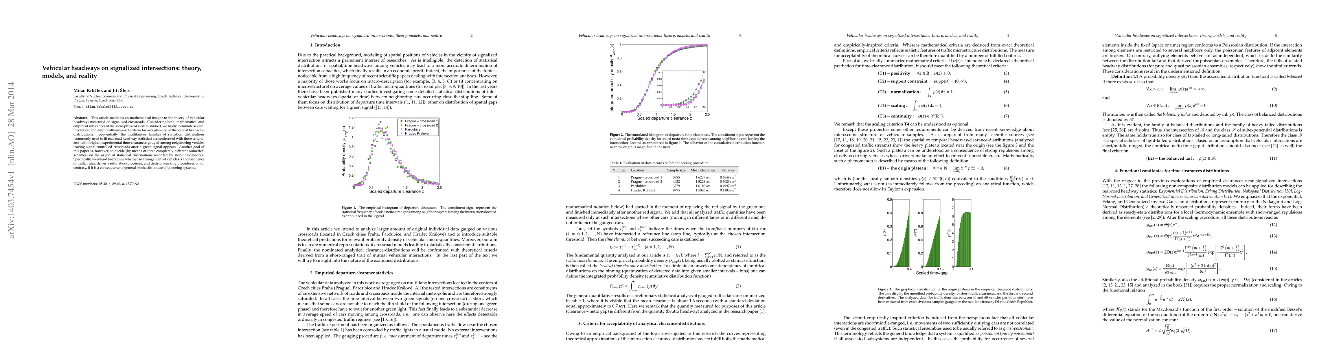 This article mediates an mathematical insight to the theory of vehicular headways measured on signalized crossroads. Considering both, mathematical and empirical substances of the socio-physical system studied, we firstly formulate several theoretical and empirically-inspired criteria for acceptability of theoretical headway-distributions. Sequentially, the multifarious families of statistical distributions (commonly used to fit real-road headway statistics) are confronted with these criteria, and with original experimental time-clearances gauged among neighboring vehicles leaving signal-controlled crossroads after a green signal appears. Another goal of this paper is, however, to decide (by means of three completely different numerical schemes) on the origin of statistical distributions recorded by stop-line-detectors. Specifically, we intend to examine whether an arrangement of vehicles is a consequence of traffic rules, driver's estimation-processes, and decision-making procedures or, on contrary, if it is a consequence of general stochastic nature of queueing systems.