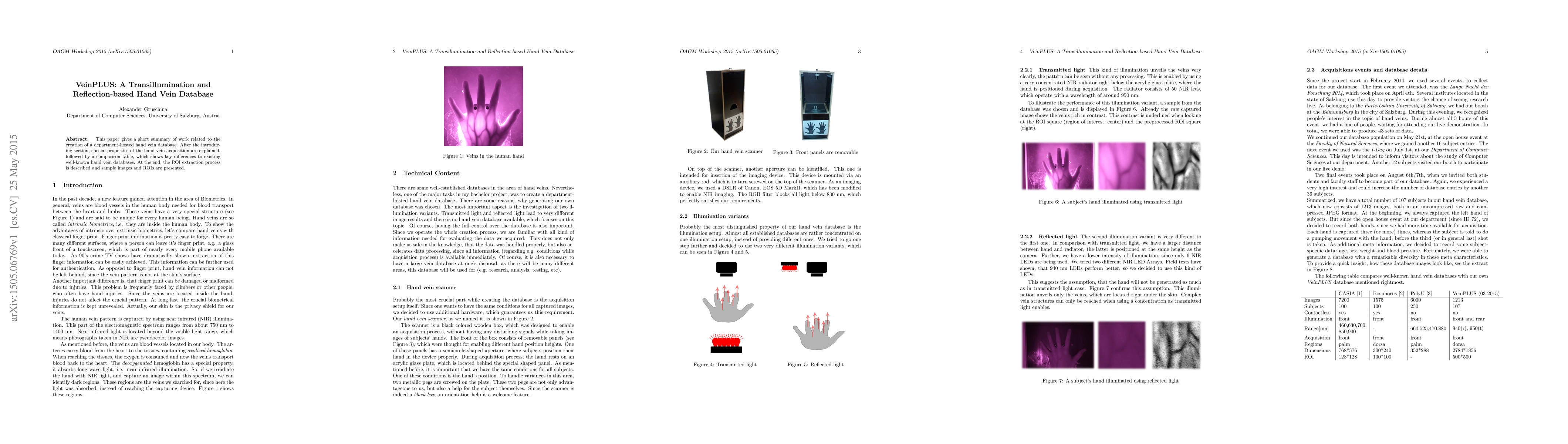 The VeinPLUS database is a new hand vein dataset created using transillumination and reflection techniques. It includes a detailed comparison of its properties with existing hand vein databases and showcases the region of interest (ROI) extraction process with sample images.