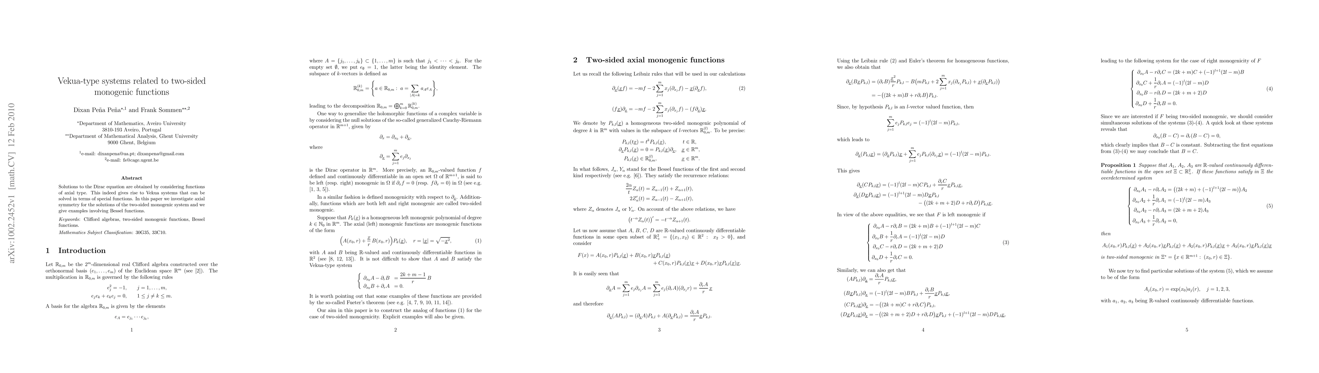 This paper explores solutions to the Dirac equation through axial symmetry and Vekua systems, demonstrating how these relate to two-sided monogenic functions and providing examples using Bessel functions.