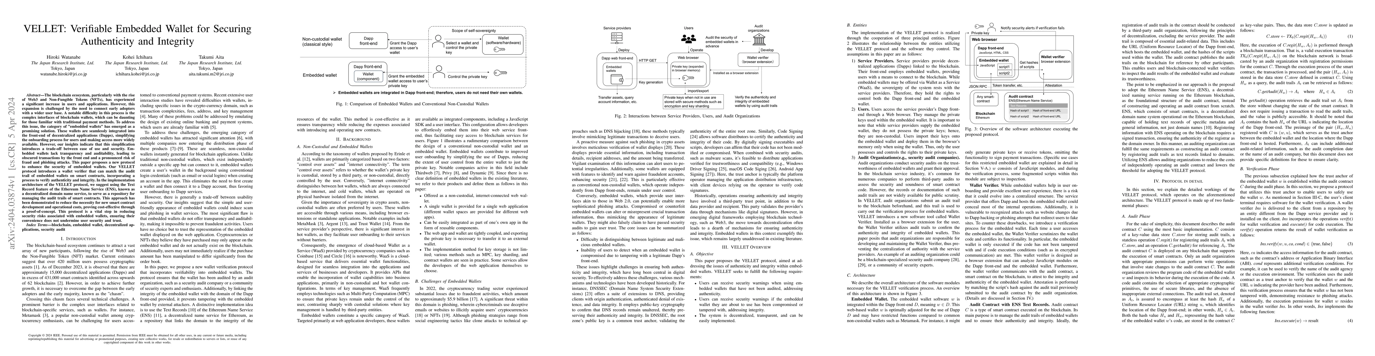 The VELLET protocol proposes a verifiable embedded wallet for securing authenticity and integrity in blockchain applications, addressing the security risks introduced by simplified wallet interfaces. Utilizing the Ethereum Name Service (ENS) for managing smart contract audit trails, VELLET aims to enhance security without compromising user convenience.
