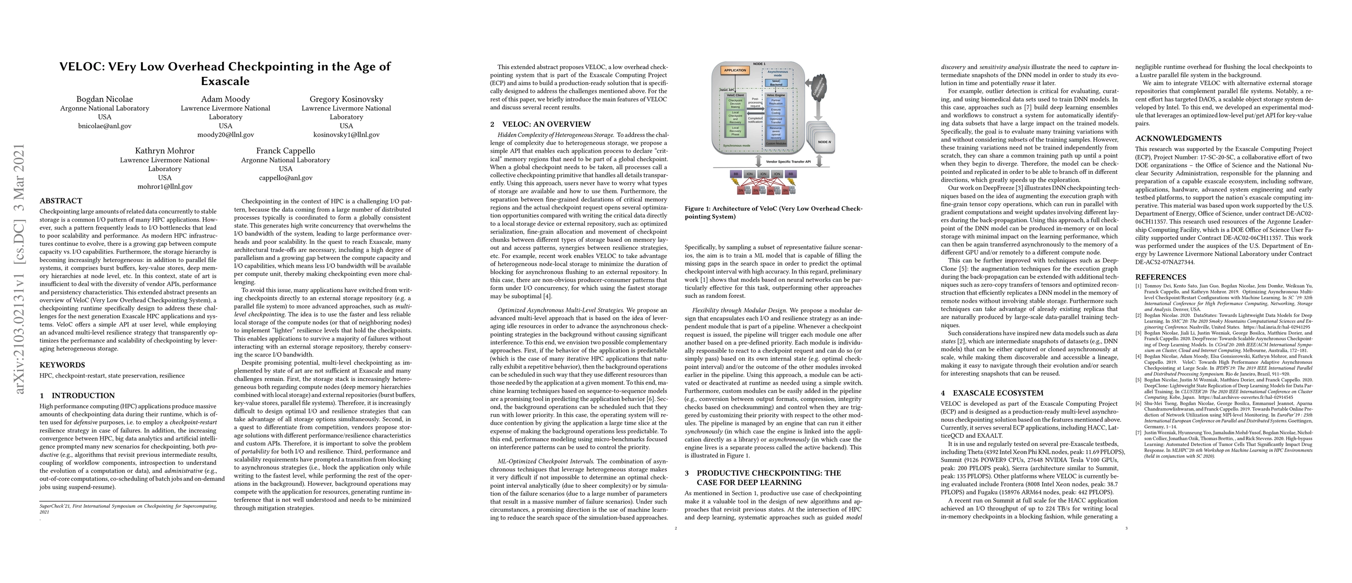 VeloC is a novel checkpointing system designed to tackle I/O bottlenecks in exascale HPC applications by leveraging heterogeneous storage. It offers a simple API and optimizes performance through a multi-level resilience strategy.