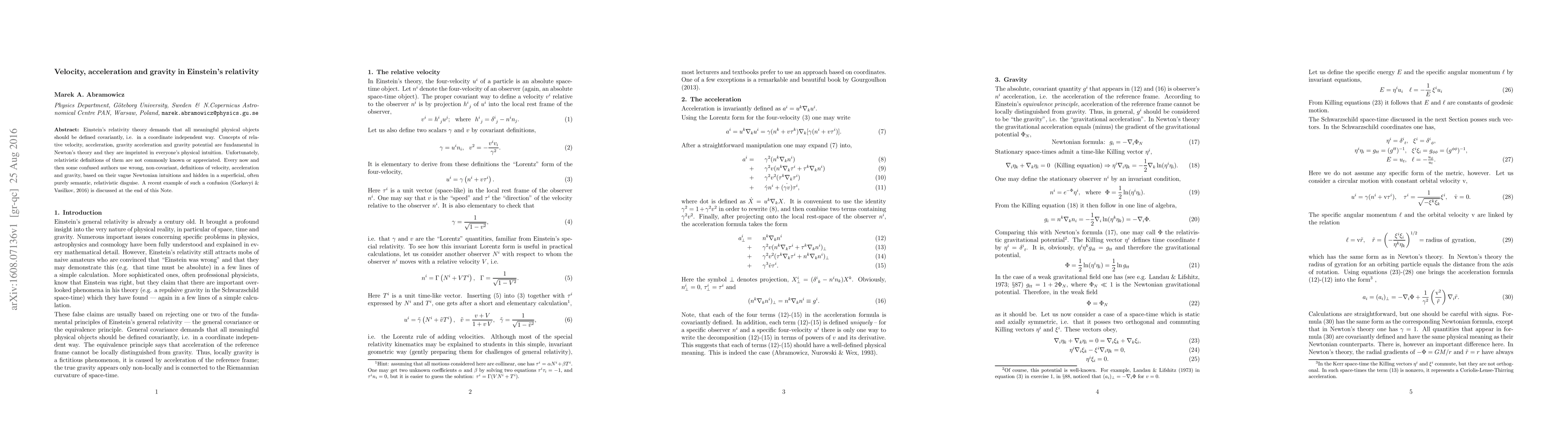 Einstein's relativity theory demands that all meaningful physical objects should be defined covariantly, i.e. in a coordinate independent way. Concepts of relative velocity, acceleration, gravity acceleration and gravity potential are fundamental in Newton's theory and they are imprinted in everyone's physical intuition. Unfortunately, relativistic definitions of them are not commonly known or appreciated. Every now and then some confused authors use wrong, non-covariant, definitions of velocity, acceleration and gravity, based on their vague Newtonian intuitions and hidden in a superficial, often purely semantic, relativistic disguise. A recent example of such a confusion (Gorkavyi & Vasilkov, 2016) is discussed at the end of this Note.