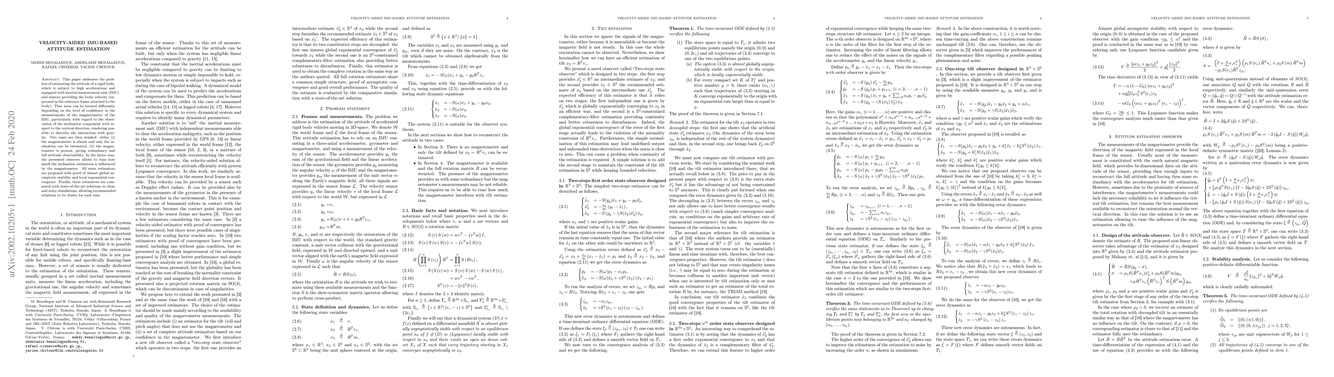 This paper develops new methods for estimating a rigid body's attitude using an IMU with velocity measurements, considering cases with and without magnetometer data. The proposed estimators show almost global asymptotic stability and local exponential convergence in simulations.