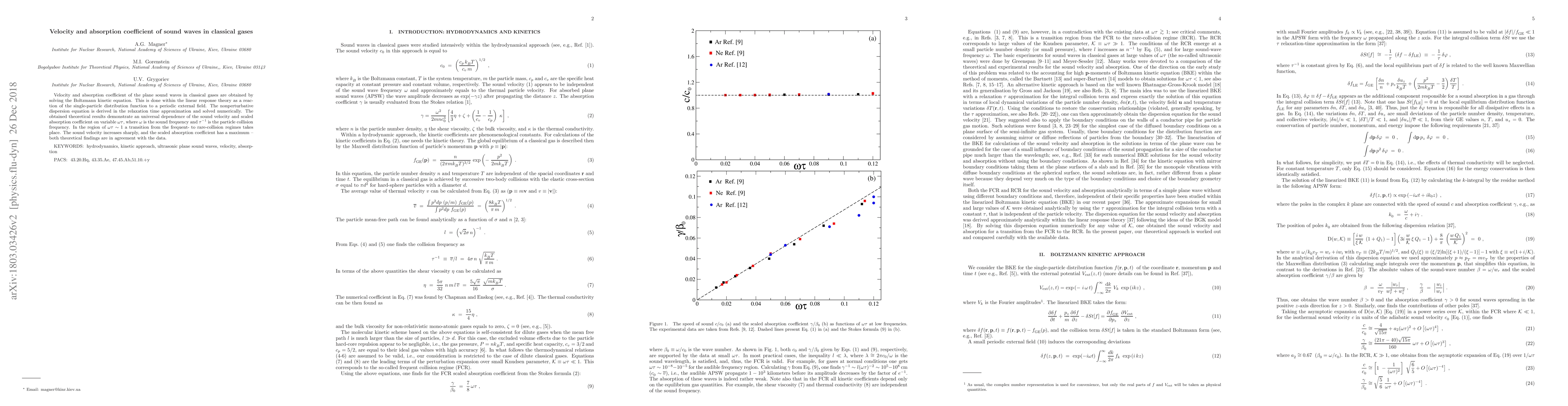 This paper derives the velocity and absorption coefficient of sound waves in classical gases using the Boltzmann kinetic equation and linear response theory. The results show a universal dependence on the ratio of sound frequency to collision frequency, revealing a transition in regimes and a sharp increase in sound velocity with a maximum absorption coefficient at $\omega\tau \sim 1$.