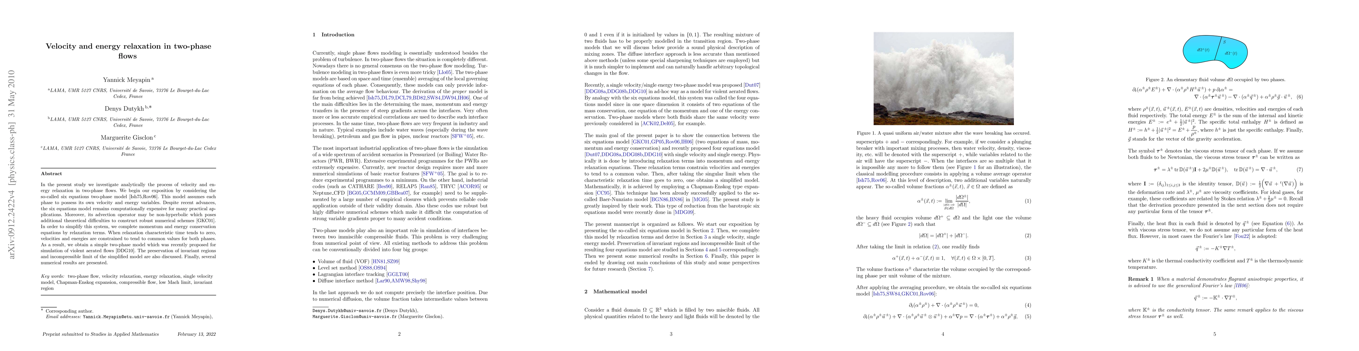 In the present study we investigate analytically the process of velocity and energy relaxation in two-phase flows. We begin our exposition by considering the so-called six equations two-phase model [Ishii1975, Rovarch2006]. This model assumes each phase to possess its own velocity and energy variables. Despite recent advances, the six equations model remains computationally expensive for many practical applications. Moreover, its advection operator may be non-hyperbolic which poses additional theoretical difficulties to construct robust numerical schemes |Ghidaglia et al, 2001]. In order to simplify this system, we complete momentum and energy conservation equations by relaxation terms. When relaxation characteristic time tends to zero, velocities and energies are constrained to tend to common values for both phases. As a result, we obtain a simple two-phase model which was recently proposed for simulation of violent aerated flows [Dias et al, 2010]. The preservation of invariant regions and incompressible limit of the simplified model are also discussed. Finally, several numerical results are presented.